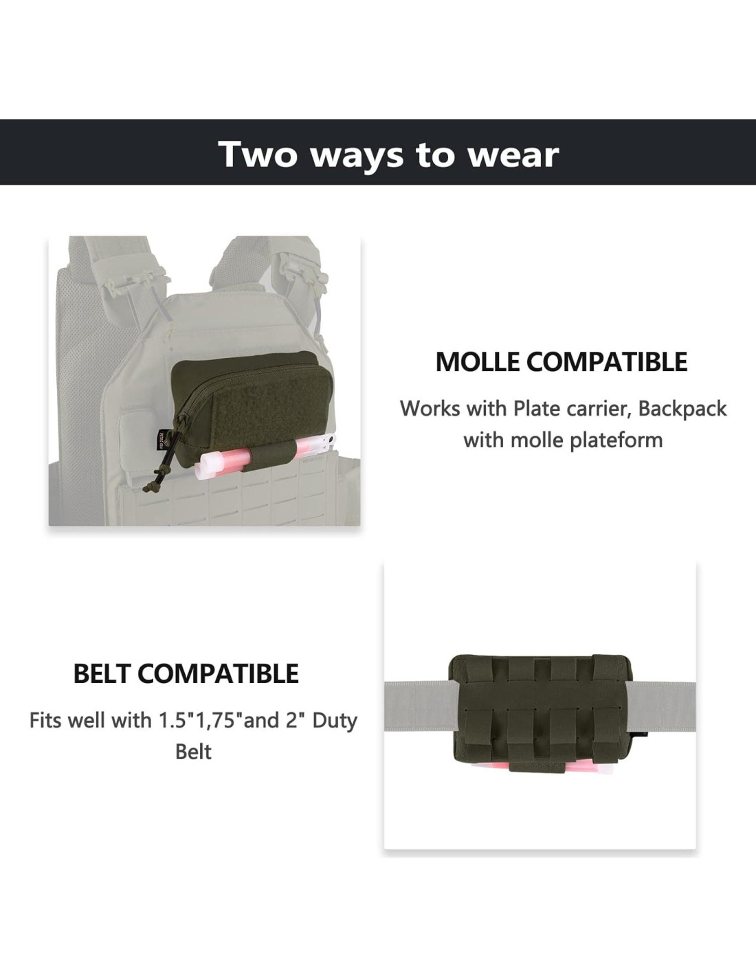 - *Se ajusta: Diseñado para portaplacas con molle, funciona también con cinturones. Se ajusta al sistema MOLLE/PALS estándar y se adapta a cinturones de servicio de hasta 2" (5.08 cm).