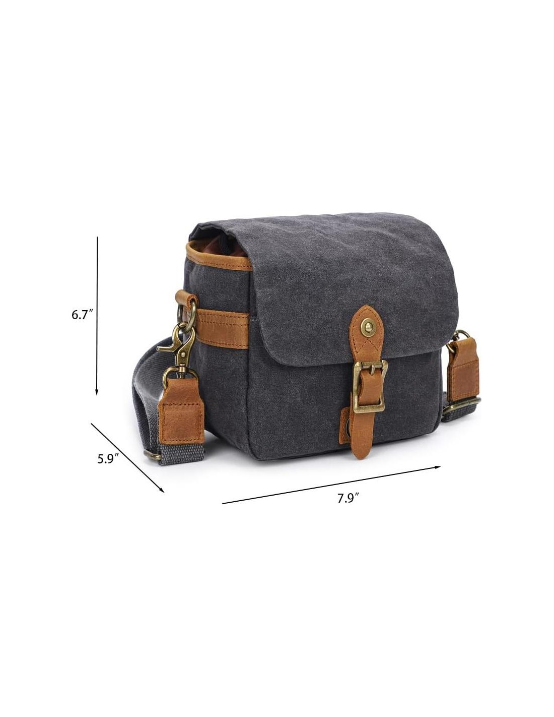 H 17 cm x L 20 cm x W 15 cm; Peso: 0.48 kg (1 lbs); Viene con una correa de hombro removible y ajustable de 109 cm; Los divisores ajustables permiten un almacenamiento conveniente de una cámara DSLR, 1-2 lentes adicionales y varios accesorios de cámara. Puede servir como una bolsa de cámara tipo bandolera, así como una bolsa de cámara cruzada, bolsa de hombro para mujeres y hombres. Al quitar los divisores internos, se puede convertir fácilmente de una bolsa de cámara en una bolsa de hombro diaria. Funda de cámara hecha de lona vintage impermeable y duradera. El acolchado grueso del interior y la solapa en la parte superior trabajan juntos para proteger el equipo de la cámara de golpes y choques.