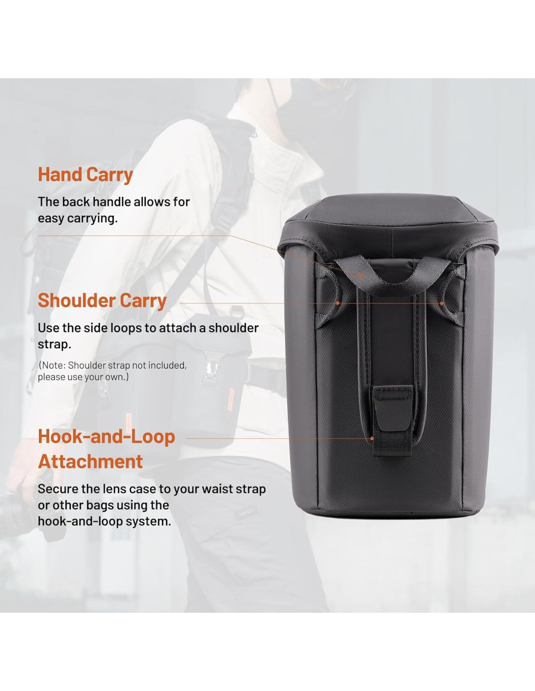 - Diseño de cierre magnético: Cambios rápidos de lente, con una sola mano. La hebilla magnética hace que los cambios rápidos sean sin esfuerzo, más conveniente que un zipper o cordón, manteniéndote listo para la próxima toma. Después de cerrar, presiona suavemente la tapa de la funda para asegurarte de que la hebilla magnética esté bloqueada de forma segura.
