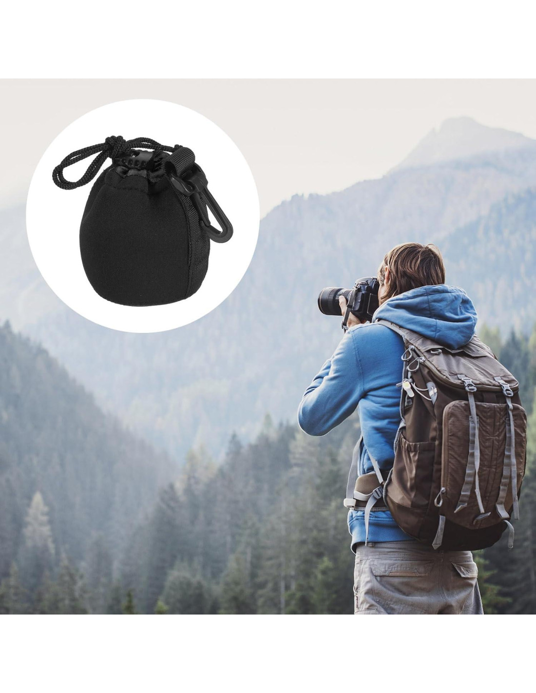 - Ventaja: 1. La bolsa de lente con correa y un gancho, puedes elegir llevar la bolsa a mano o colgarla en tu mochila y cinturón. 2. El diseño de cuerda de ajuste puede proteger el lente de caídas accidentales, y la bolsa de lente de cámara de 5 mm de grosor es impermeable, resistente al desgaste y a prueba de golpes, asegurando protección contra condiciones climáticas adversas, colisiones accidentales y rasguños.