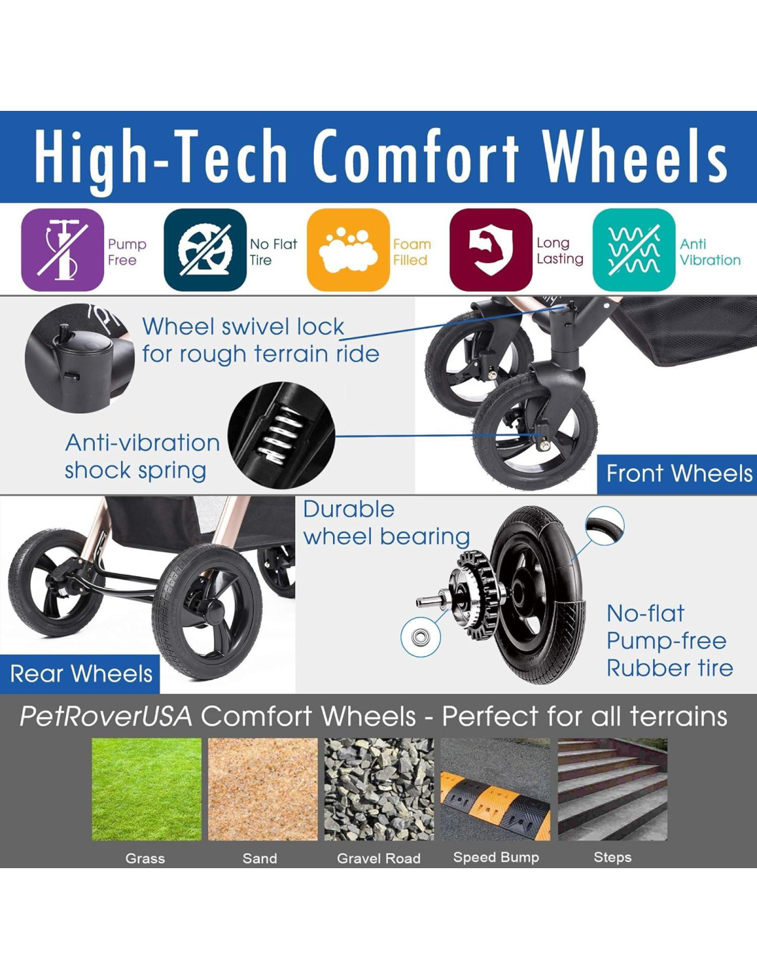 - RUEDAS DE CAUCHO SIN BOMBA - La suspensión delantera con cuatro neumáticos de caucho de grado automotriz, libres de mantenimiento, reduce la vibración y maximiza la estabilidad, para que tu mascota disfrute de un viaje cómodo en cualquier terreno.