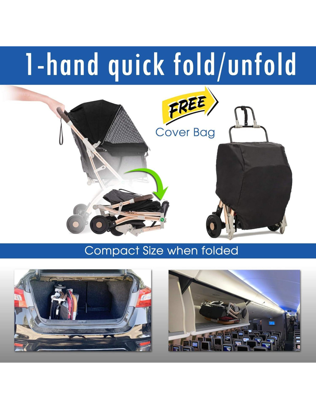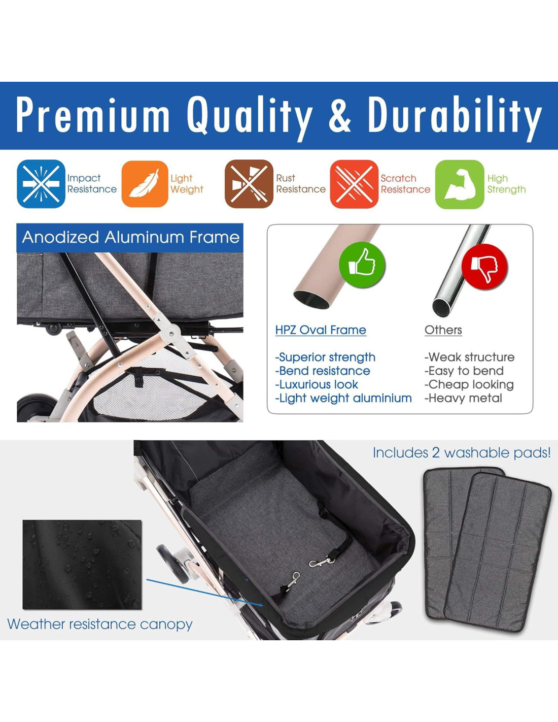 EL CARRO DE MASCOTAS DE VIAJE LIGERO PERFECTO + BOLSA DE VIAJE GRATIS de PetRoverUSA Nuevas Características del Carrito de Paseo HPZ Pet Rover Lite:?? TAMAÑO PLEGADO SUPER COMPACTO Cuando está plegado, es más pequeño que un equipaje pequeño aprobado por aerolíneas, perfecto para entrar y salir de autos, autobuses, trenes o aviones.?? COMPARTIMENTO DE TAMAÑO CONVERTIBLE Tanto el frente como la parte trasera pueden expandirse de 33 cm a 68.6 cm de largo (33 cm de ancho) para acomodar una mascota mediana o múltiples mascotas más pequeñas de hasta 20.4 kg en total.?? PLEGADO/DESPLEGADO CON UNA MANO - Mecanismo innovador que permite plegar y desplegar rápidamente con solo una mano en segundos.?? CIERRE DE CAPOTA SIN CREMALLERA Características innovadoras de cierre sin cremallera con pestillos de fácil bloqueo, para acceso inmediato a su mascota sin tener que lidiar con cremalleras.?? ESTRUCTURA RÍGIDA DE ALUMINIO - La estructura del carrito está hecha de aluminio resistente a la corrosión en un color dorado anodizado para una construcción ligera, elegante, funcional y duradera.?? SOPORTE INTEGRADO PARA BOL DE COMIDA - Soporte de bol retráctil innovador mantiene a las mascotas alimentadas en cualquier lugar y en cualquier momento.?? CARACTERÍSTICAS CONVENIENTES AMIGABLES PARA VIAJES - El mango de remolque retráctil permite transportar el carrito plegado con facilidad. La función de bloqueo automático evita que el carrito se expanda inesperadamente cuando está plegado.?? RUEDAS DURADERAS Ruedas duraderas con suspensión delantera que reduce la vibración y maximiza la estabilidad en todo tipo de terreno.?? CUBIERTA DE MANILLAR DE PU-LEATHER PREMIUM La lujosa y duradera cubierta de PU-leather proporciona un manejo cómodo del carrito.?? MUCHO ESPACIO DE ALMACENAMIENTO - 3 bolsillos organizadores y una gran canasta inferior proporcionan mucho espacio de almacenamiento.?? CARACTERÍSTICAS CONVENIENTES AMIGABLES PARA MASCOTAS - Ventana trasera y 3 niveles de apertura de capota proporcionan flexibilidad de visualización.?? NO SE REQUIERE MONTAJE - El ensamblaje Plug&Play de 1 minuto requiere solo colocar las ruedas del frente y la parte trasera. Peso=7.1 kg/Capacidad Máxima=20.4 kg Tamaño del Carrito=71.1Lx101.6Hx35.6frente&50.8trasero-(35.6Lx50.8Wx55.9H cm plegado) Suelo del Compartimento para Mascotas=33Lx33Wcm a 68.6