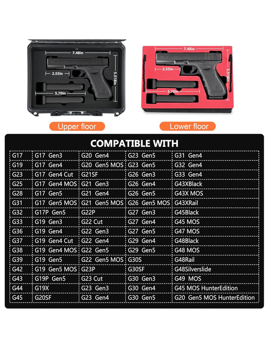 - Diseñada para la caja de Glock: Esta caja doble para pistolas cuenta con un interior de esponja acolchada cortada con precisión, diseñada para pistolas Glock, asegurando un ajuste ceñido y seguro para evitar el movimiento. Acomoda G17/G19/G19 Gen 5/G23/G23 Gen 4/G26/G27/G30/G30 Gen 4/G31/G31 Gen 4/G32/G33/G36/G42/G43/G43X. Nota: No se admiten visores ni otros accesorios