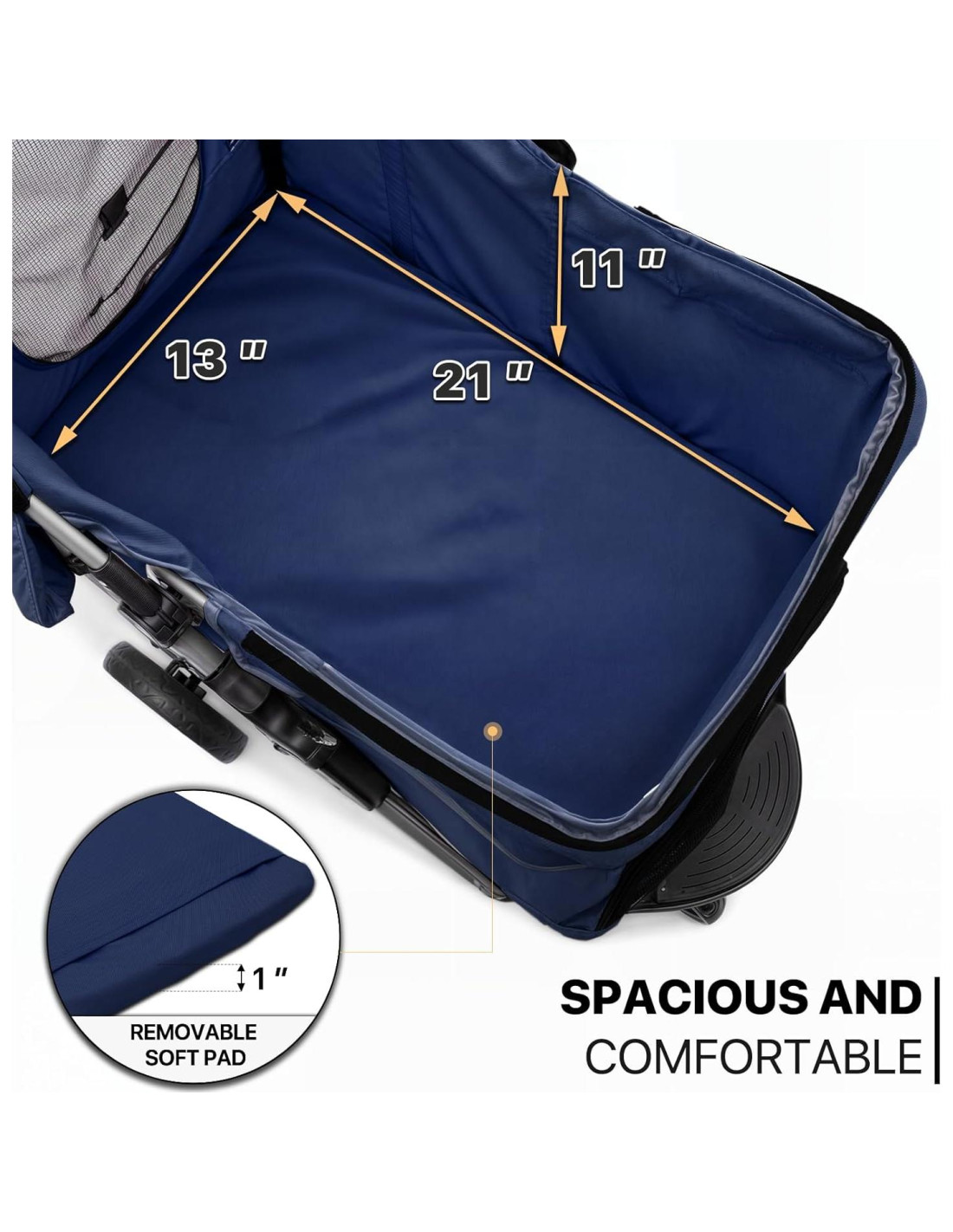 - Diseño Humanizado - Con características convenientes como ruedas delanteras giratorias, portavasos y una ventana en la parte superior con capota, este carrito para mascotas hace que llevar a tu mascota a hacer ejercicio y tomar aire fresco sea una experiencia fácil y agradable. El diseño espacioso y la canasta de almacenamiento en la parte inferior te dan mucho espacio para llevar tus esenciales también.