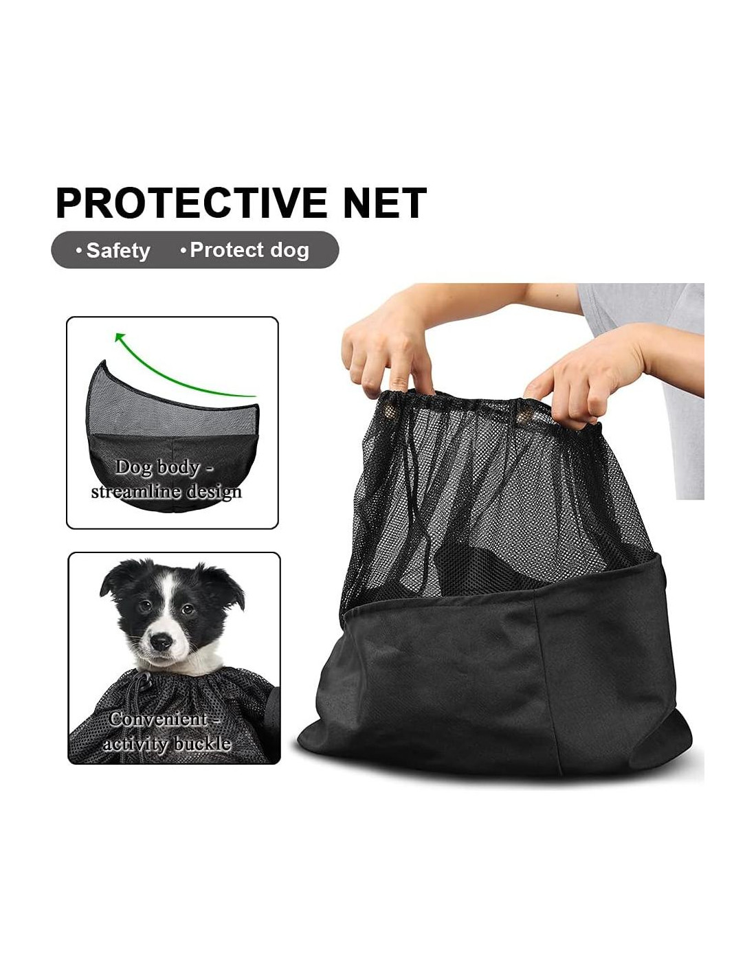 - Dispositivo de doble protección para hebilla de seguridad y malla de seguridad. La parte delantera de la malla es corta y la parte trasera es larga. El diseño se ajusta a la forma del cuerpo de la mascota, haciéndola más cómoda y segura. Puede prevenir eficazmente que el perro salte fuera. Para evitar que la hebilla se deslice, podemos hacer un nudo corredizo detrás de la hebilla después de cerrar la apertura.