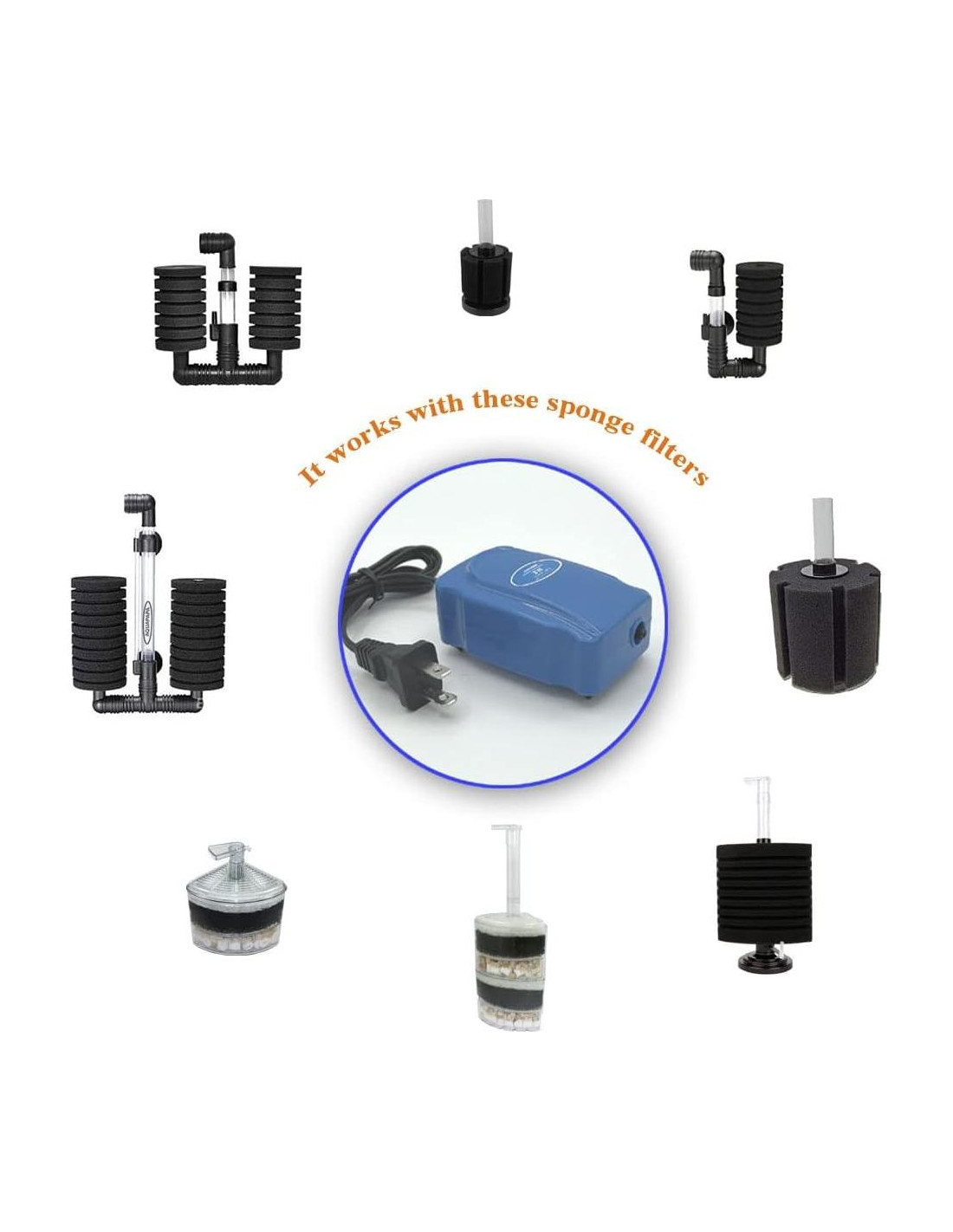 - Fuerte flujo de aire y bajo consumo. 48 GPH (181.7 LPH) con salida única; Presión: 0.018kba; Ideal para operar pequeños filtros de esponja y burbujas de aire proporcionando suficiente oxígeno disuelto para los peces.