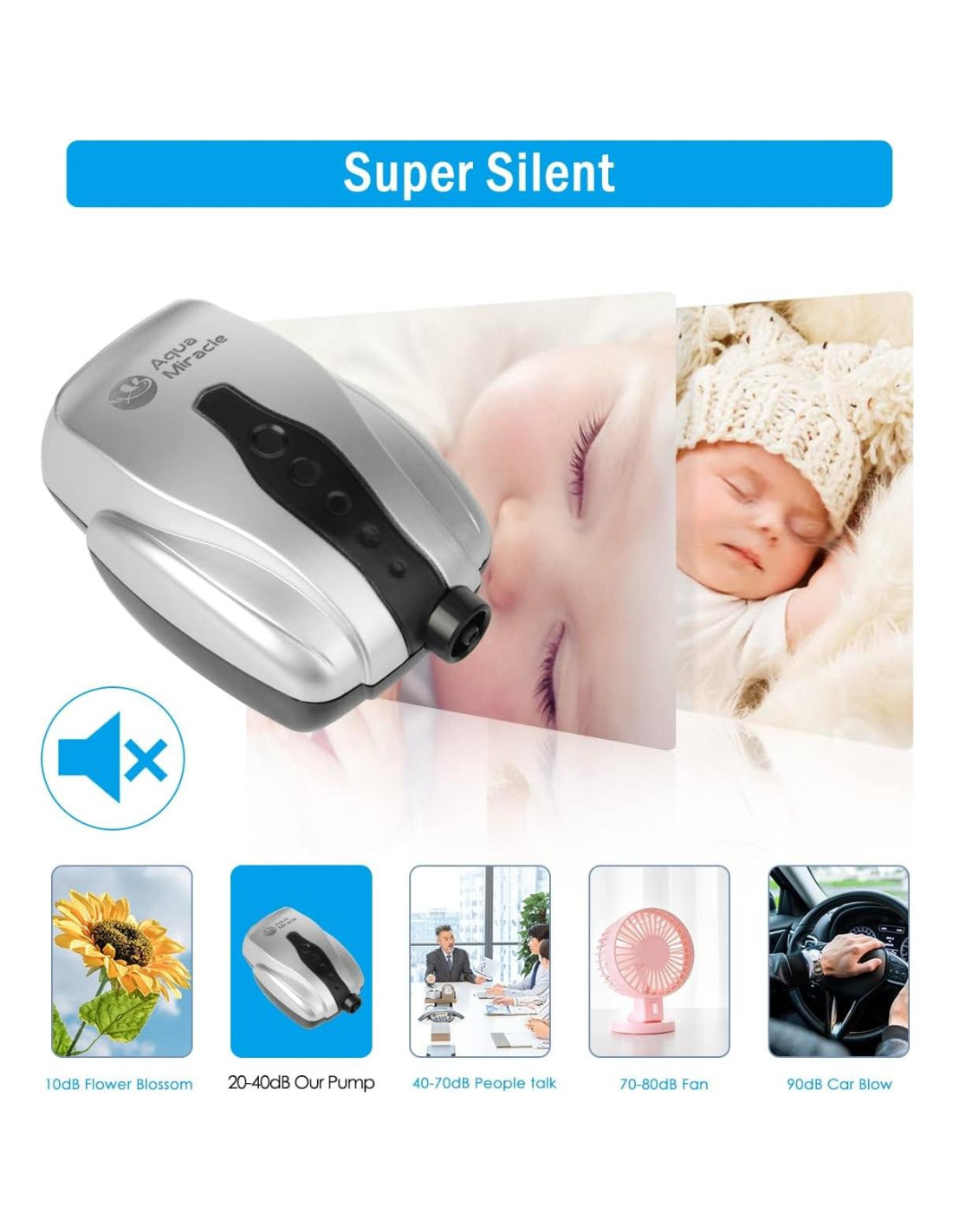 - SÚPER SILENCIOSA - La bomba de aire para acuario silenciosa utiliza tecnología innovadora con un diseño de estructura de reducción de ruido único y materiales para lograr un super silencio durante la operación.