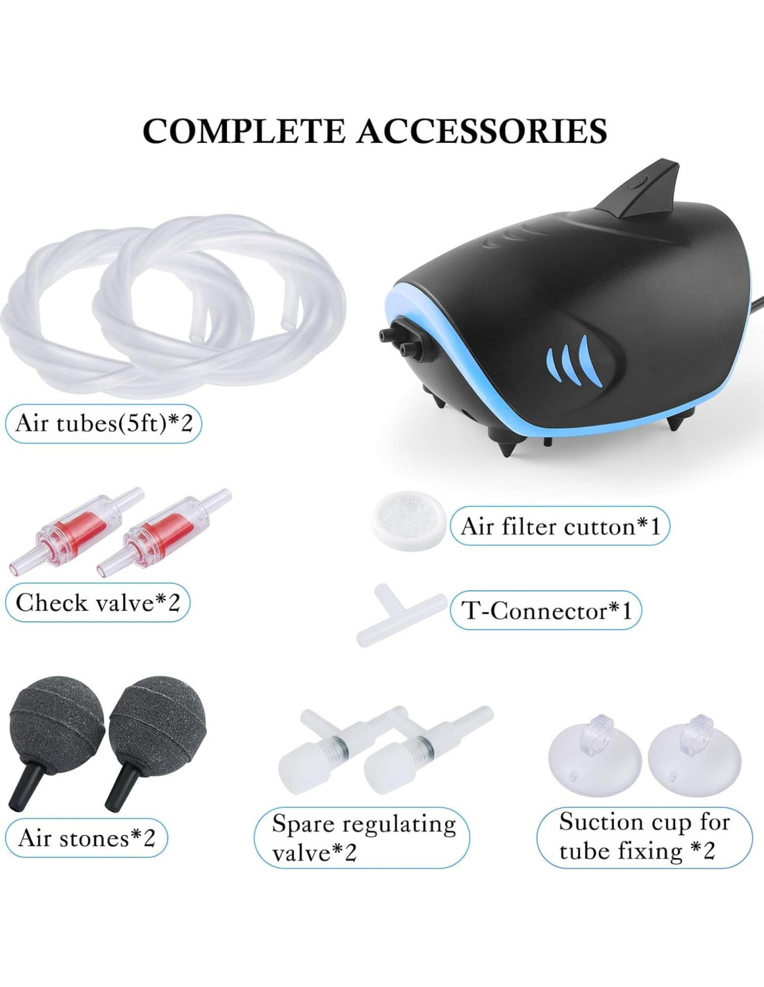 - [Accesorios Incluidos] Este aerador de acuario con cable de 4.9 pies (1,49 m) está equipado con todos los accesorios necesarios, como 2 mangueras de aire de 5 pies (1,52 m), 2 piedras de aire, 2 válvulas de retención, 2 ventosas para fijar la manguera de aire, 1 tubo conector en T y 1 algodón de entrada de aire de repuesto, lo que es posible para satisfacer sus necesidades.