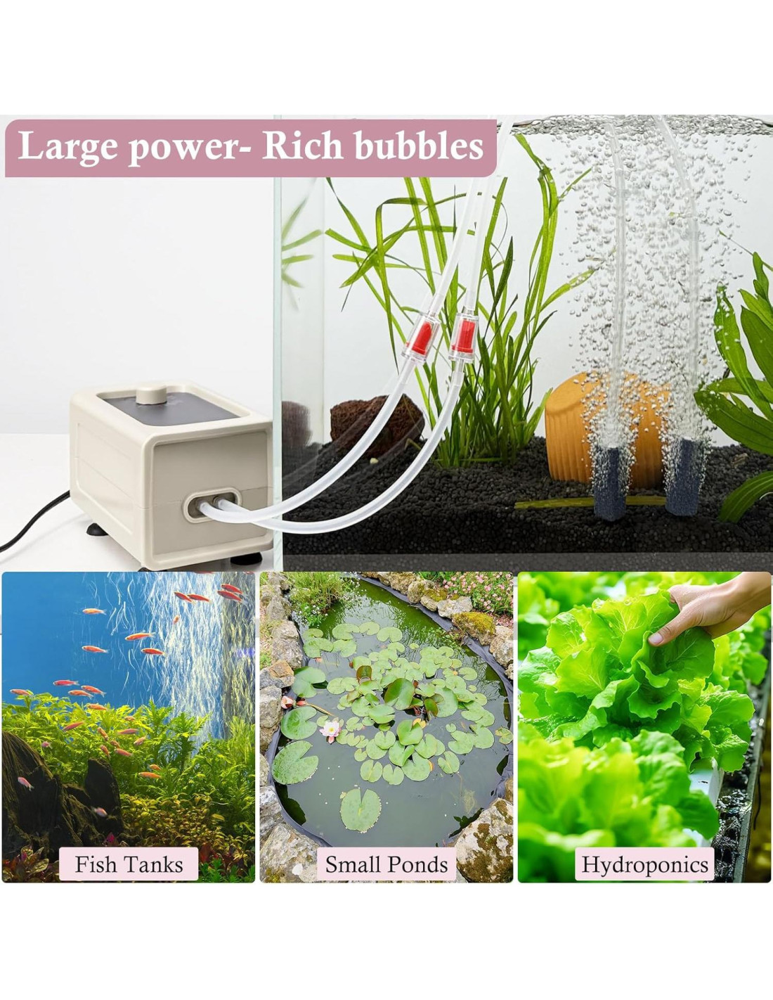- [Aerador Confiable] Todo el motor de cobre dentro de la bomba y diseñado con 2 salidas de acero inoxidable de la bomba de aire para peces, mayor vida útil y más duradera. Burbujeador de acuario de doble salida con algodón filtrante de aire en la parte inferior, puede filtrar impurezas en el aire y hacer que el aire de entrada sea más puro y estable. Proporcionamos un servicio postventa de 1 año para nuestros productos.