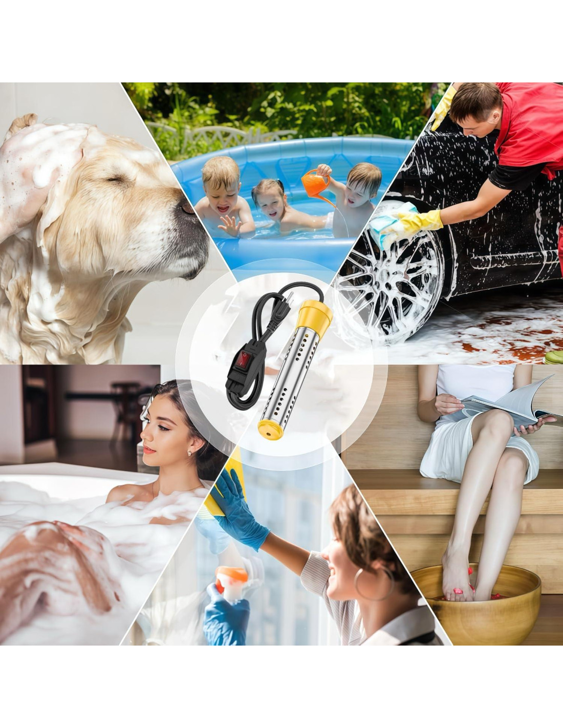 - [Uso Amplio] El calentador de agua de inmersión no solo es simple de usar, sino que también se puede usar en pequeñas piscinas inflables (mejores resultados con más de dos calentadores funcionando al mismo tiempo), sino también para jacuzzis, calentadores de bañeras, calentadores de agua bajo el fregadero, duchas de camping, hervidores de agua portátiles, calentadores de agua para ganado de granja, agua para lavar ventanas y más. Pero no es adecuado para piscinas grandes, si se calienta demasiada agua, toma más tiempo o se utilizan más de dos calentadores de agua eléctricos al mismo tiempo.