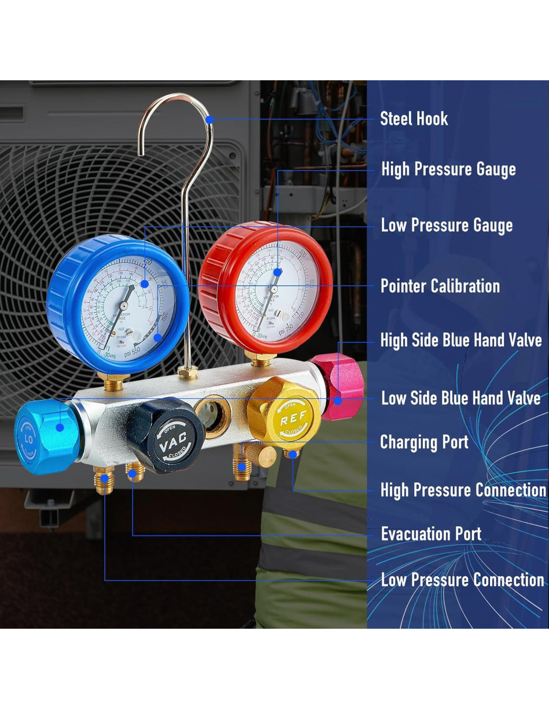 - [2. Juego de Manómetro de AC de 4 Vías Profesional, Diagnóstico de sistemas R134A, R410A, R32 y R12. No se requieren adaptadores adicionales. Diseñado para pruebas, carga y evacuación rápidas.