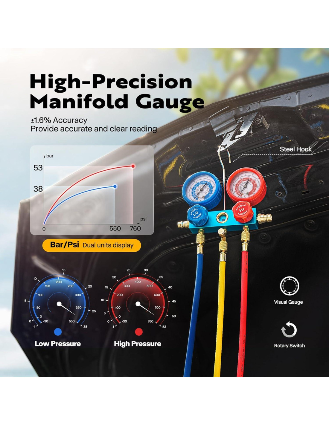 - Características especiales: Juego de Manómetro, Mangueras Codificadas por Color