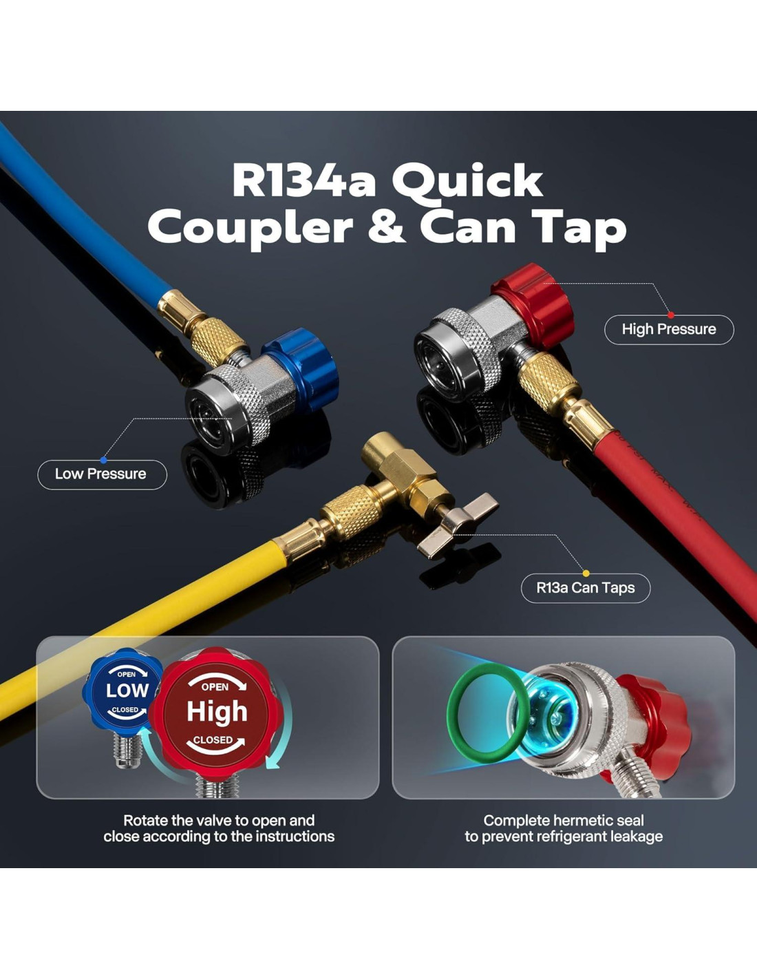 - MANGUERAS CODIFICADAS POR COLOR: Las mangueras codificadas por color ayudan a diferenciar el lado de alta presión (rojo), el lado de baja presión (azul) y la manguera de llenado (amarillo); Hechas de goma duradera y flexible con un diseño de sellado a prueba de fugas, están construidas para durar; Compatibles con sistemas R134a, R12, R22, R502 y R410a y equipadas con adaptadores de ajuste R410a de 1/4 in (0,64 cm) a 5/16 in (0,79 cm)