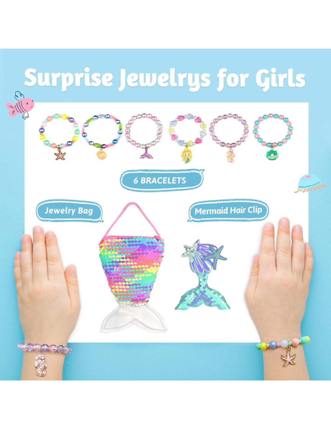 - [Bomba de baño con joyería de sirena dentro] : Cada bomba de baño para niños con sorpresa dentro, cuando tu niña deja caer la bomba de baño en el agua, obtendrá una pulsera temática de sirena diferente cuando la bomba de baño burbujee. 6 pulseras de sirena diferentes, bolsa de joyería y pinza para el cabello son las favoritas de las niñas, los niños pueden encontrar la joyería en la bañera, definitivamente será una gran sorpresa para los niños.