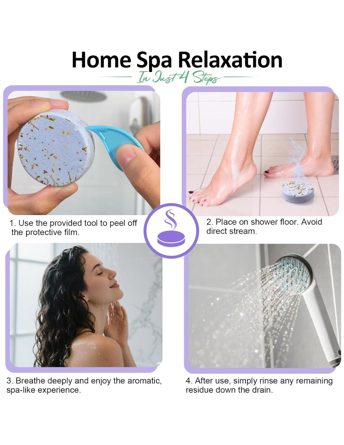 - Vapor 5X Más Fuerte - Infundido con 5 veces más aceites esenciales que los vaporizadores estándar y pétalos de flores reales, estos vaporizadores liberan vapores relajantes para aliviar el estrés, despejar los senos nasales y mejorar la relajación. Simplemente colócalo en el suelo de la ducha (evita el flujo directo de agua) para liberar vapores relajantes.