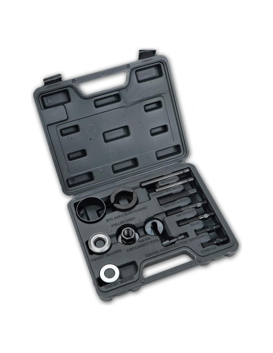 Elimina e instala sin esfuerzo las poleas del alternador y de la bomba de dirección asistida con este versátil juego de herramientas, completo con una resistente caja de almacenamiento y sin necesidad de adaptadores adicionales.