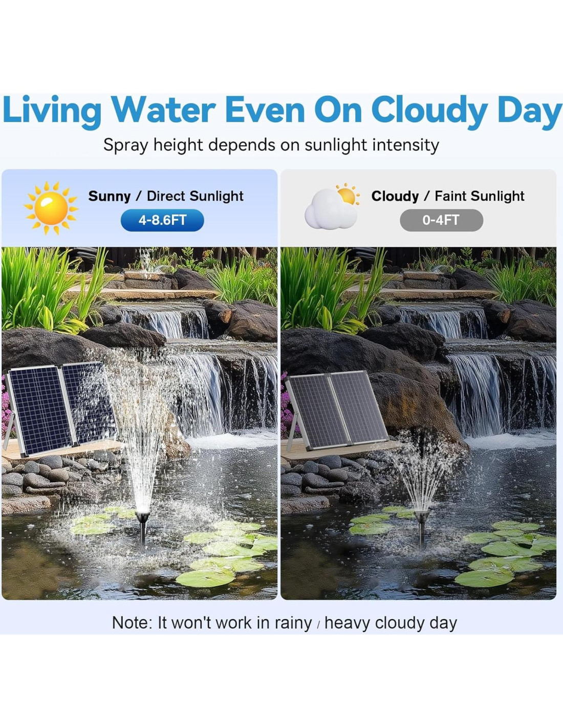- [Panel de Alta Eficiencia] La bomba de agua solar POPOSOAP 70W está hecha de celdas solares de Grado A+ y un panel solar plegable altamente eficiente, que es más duradero y tiene una mejor eficiencia de conversión de energía solar, haciendo que el rociado de agua sea más estable y duradero. Cuanto más fuerte sea la luz solar, mayor será la altura del rociado de agua.