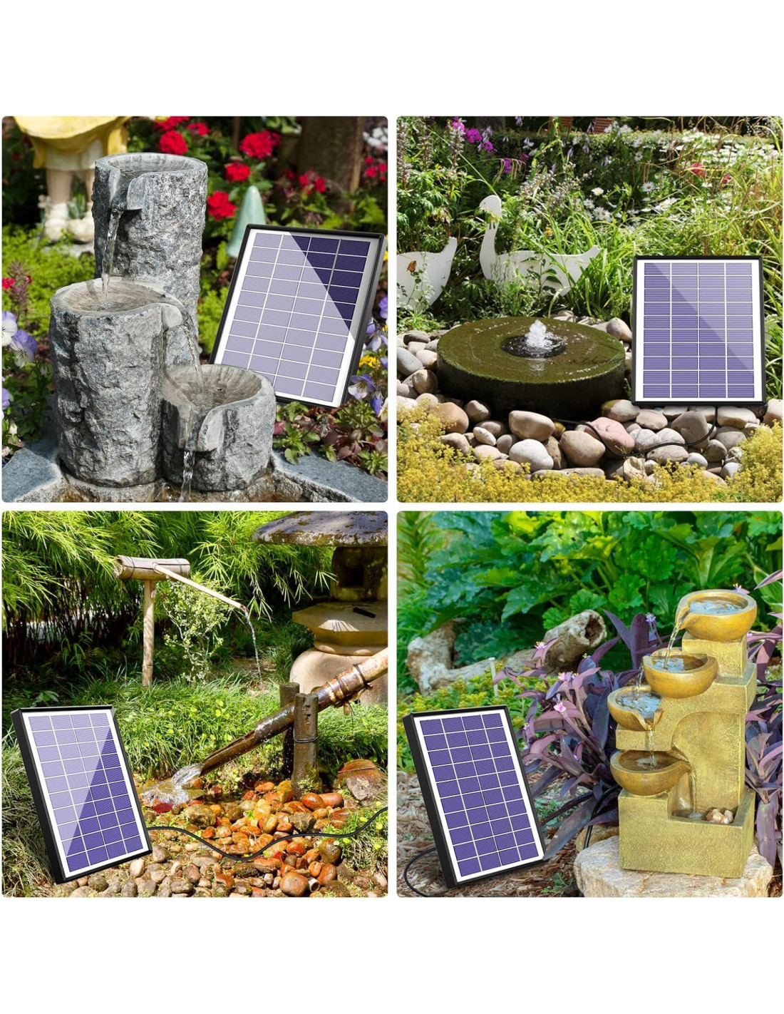 - [Multi-aplicación]: Esta bomba de agua solar utiliza un proceso de diseño separado. Puedes agregar la manguera adecuada a la bomba. Úsala para hacer características de agua al aire libre. También puedes usar esta bomba para hacer un sistema de circulación de agua. Esta bomba es muy adecuada para baños de pájaros, acuarios, pequeños estanques, piscinas, jardines y exteriores.