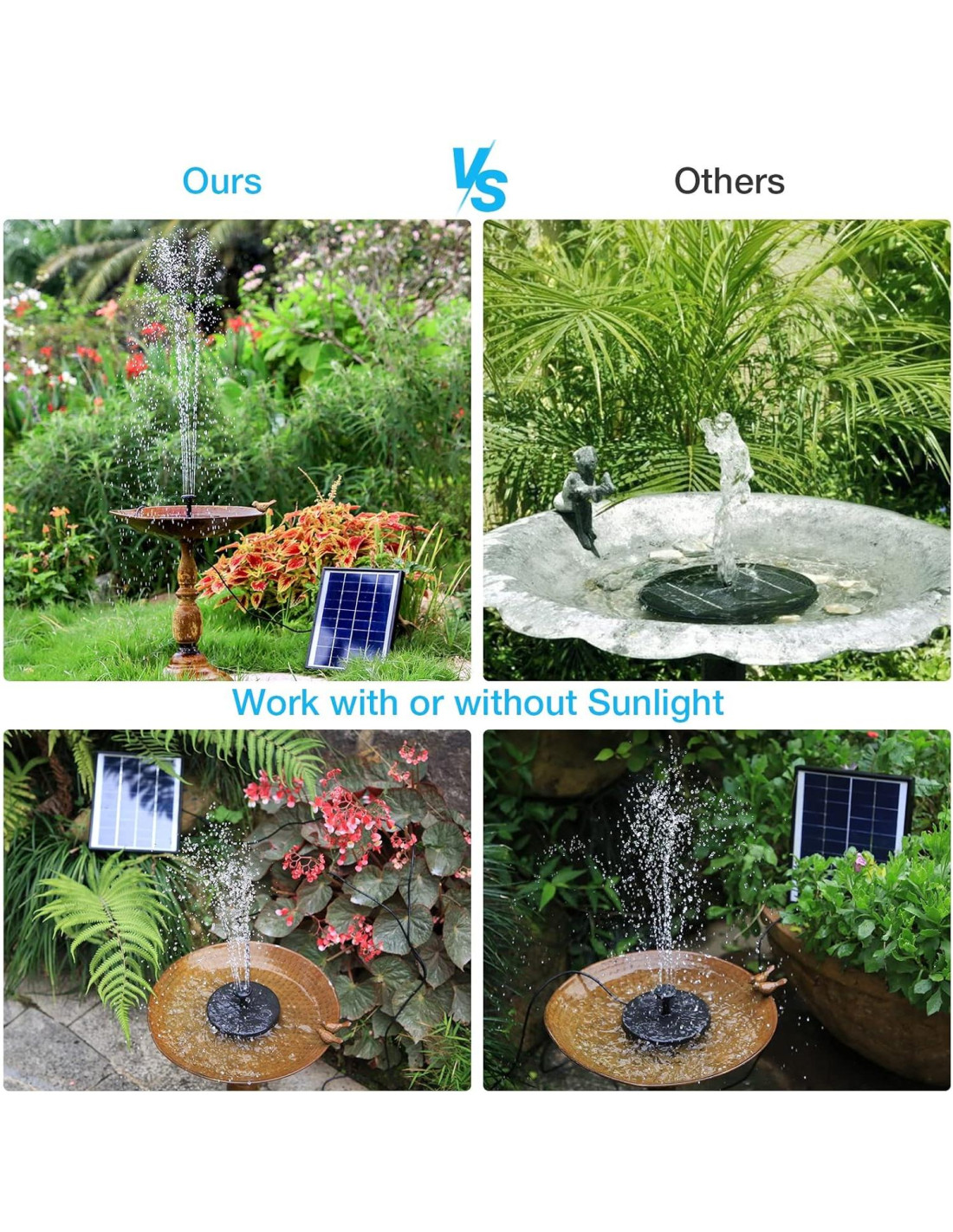 - [Consejos Útiles]: La fuente alimentada por energía solar tiene protección automática de apagado y se detendrá automáticamente cuando salga del agua. Nota: 1. Mantén el panel solar limpio para evitar la conversión de energía solar. 2. Debes limpiar la bomba regularmente para evitar que se obstruya con polvo. 3. Por favor, mantén la bomba por debajo del nivel. 4. Por favor, contacta al servicio al cliente si encuentras problemas con la bomba de agua.