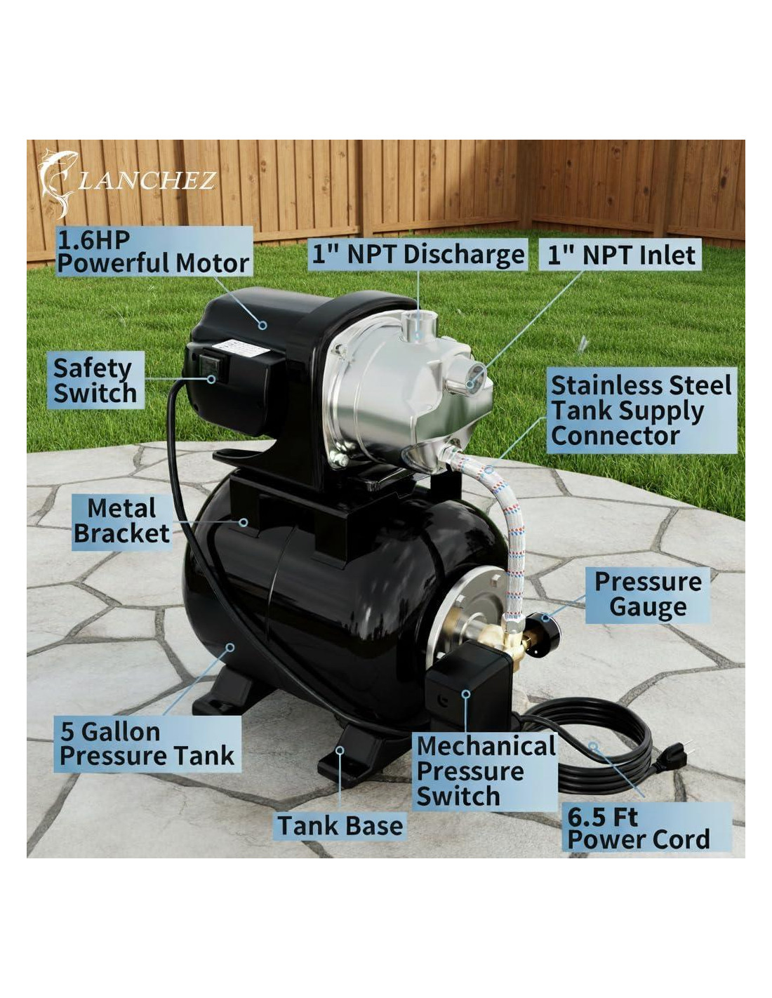 - Fácil operación - Esta bomba de pozo superficial es fácil de operar, comienza a 20psi y se apaga a 40psi, y viene con un interruptor de presión y un manómetro externo para visibilidad en tiempo real de su tanque. El tanque de presión compacto de 5 galones (18.93 litros) prolonga su vida útil. El interruptor impermeable de encendido/apagado asegura una operación segura