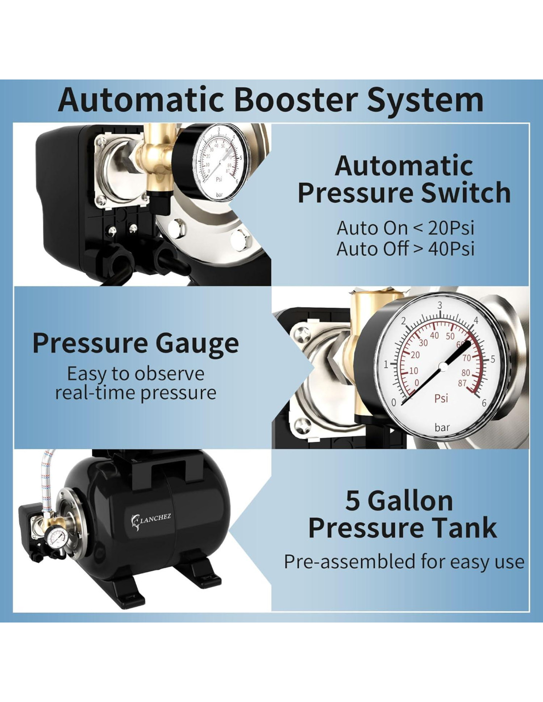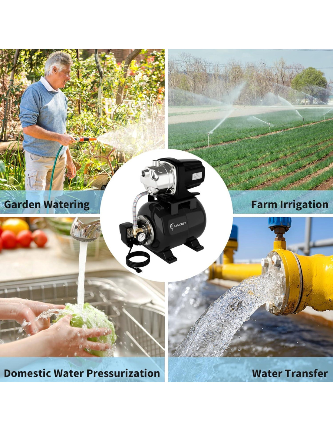 - Duradero - Nuestra bomba de refuerzo de presión de agua está hecha de un revestimiento de acero inoxidable de alta calidad, proporcionando una durabilidad excepcional y resistencia a la corrosión. La bomba de riego también cuenta con un cable de alimentación de 6.5 pies (1.98 metros), enchufe a tierra y operación silenciosa, lo que la convierte en una bomba de refuerzo de presión de agua ideal para hogares