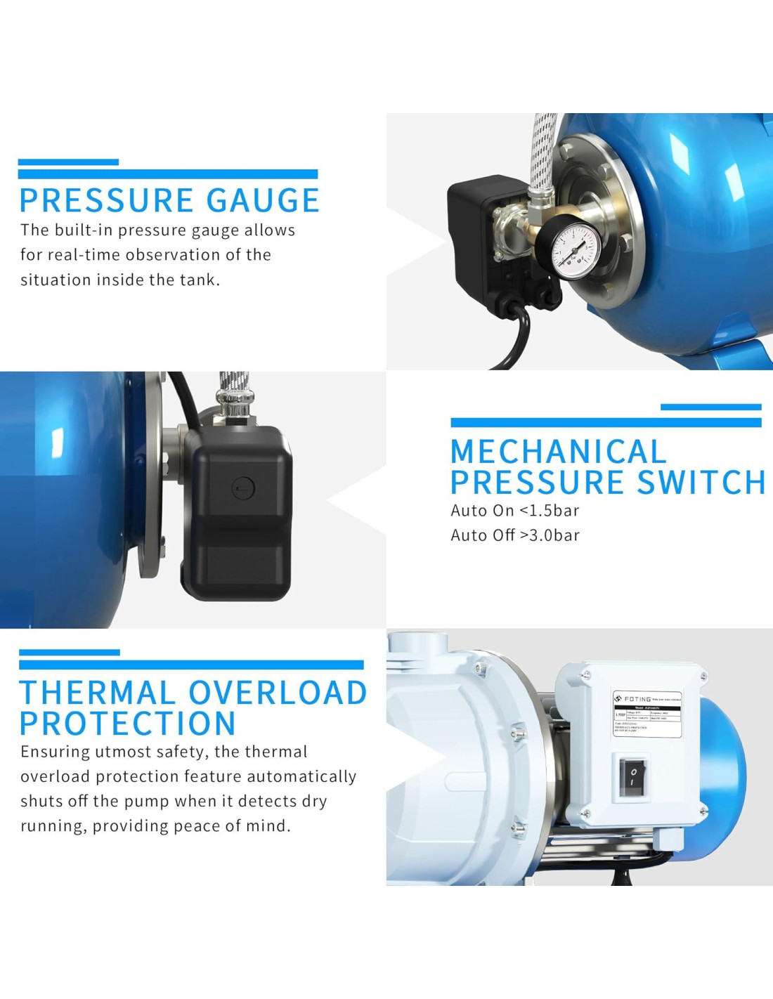 - [Aumento de Tuberías y Automático] Tanque de agua de 5 Gal con interruptor de presión puede mantener automáticamente y de forma segura la presión de agua todo el día. El interruptor de presión está preestablecido a un rango de 4.5 bar, lo que hace que esta bomba sea un perfecto aumentador de presión de agua para el hogar. Y el manómetro bien ensamblado facilita la observación oportuna de la presión del agua. El interruptor de presión automático permite que la bomba se encienda a 1.5 bar y se apague a 3 bar.