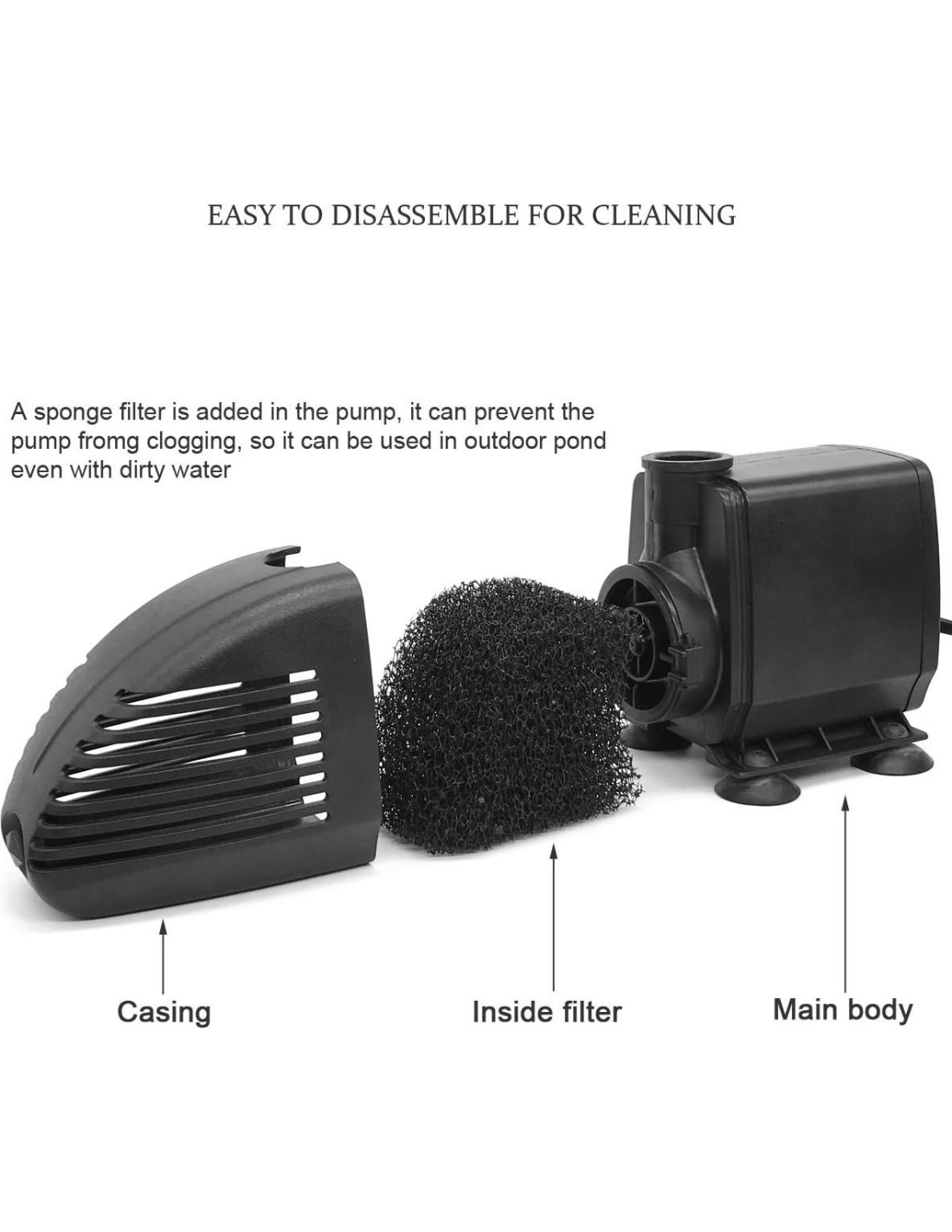 - Tasa de flujo máxima: 660GPH, Altura máxima (altura de elevación): 6.5ft (2m), motor de alta eficiencia de 45W para ahorro de energía. Diseñado para fiabilidad y operación ultra silenciosa. (Longitud del cable de alimentación: 1.9M=6.2ft)