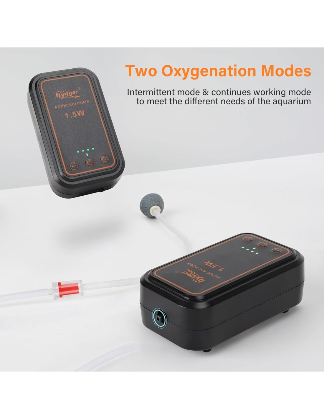 bomba de aire para acuario hygger, bomba de oxígeno portátil recargable con salidas simples/dobles, burbujeador de aire alimentado por batería ultra silencioso para tanque de peces de hasta 33/170/200 galones (125/643/757 litros) con accesorios