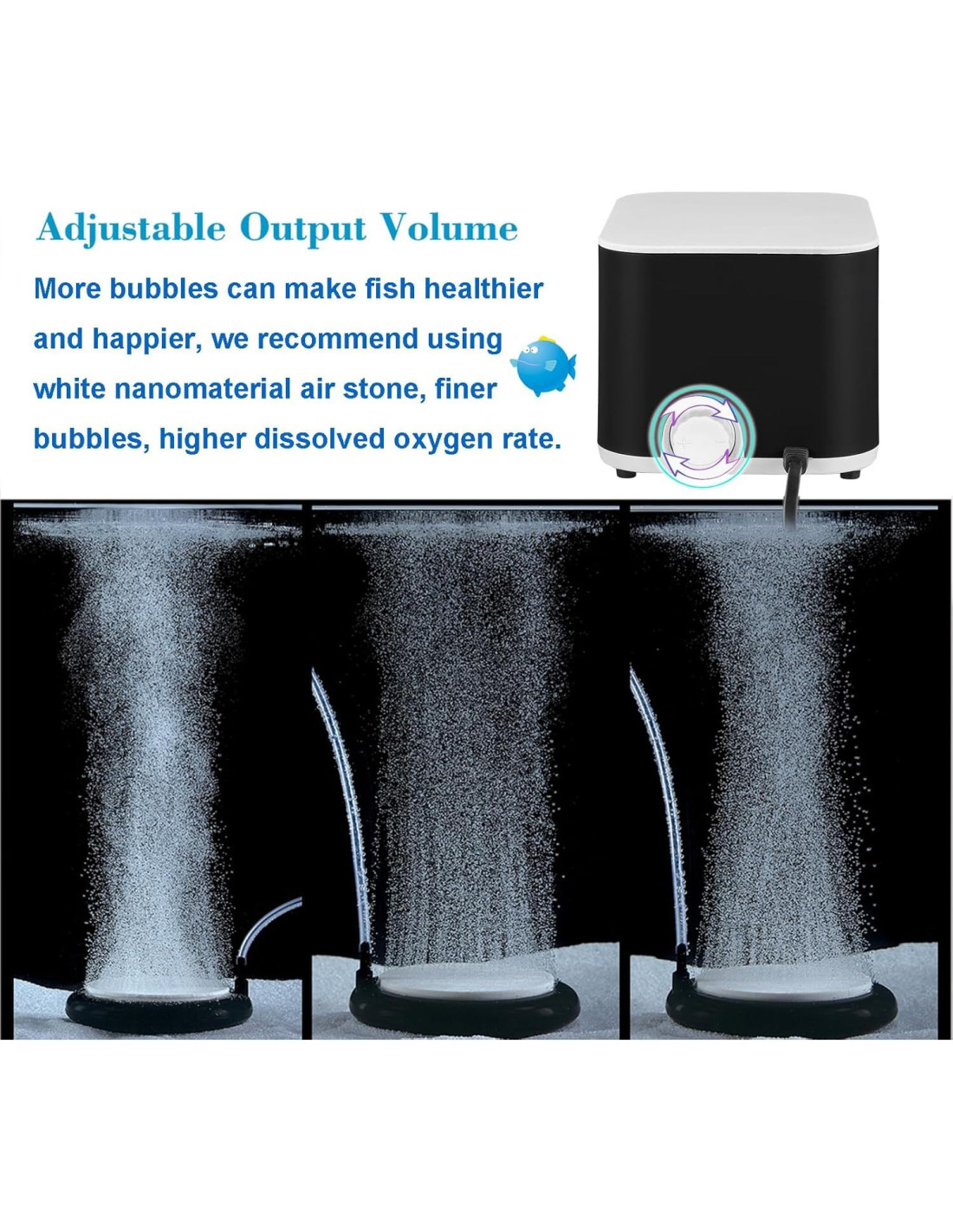 - Bomba de Aire Ajustable: Con perilla de control de ajuste, el flujo de aire se puede ajustar según tus propias preferencias, hasta 160GPH.