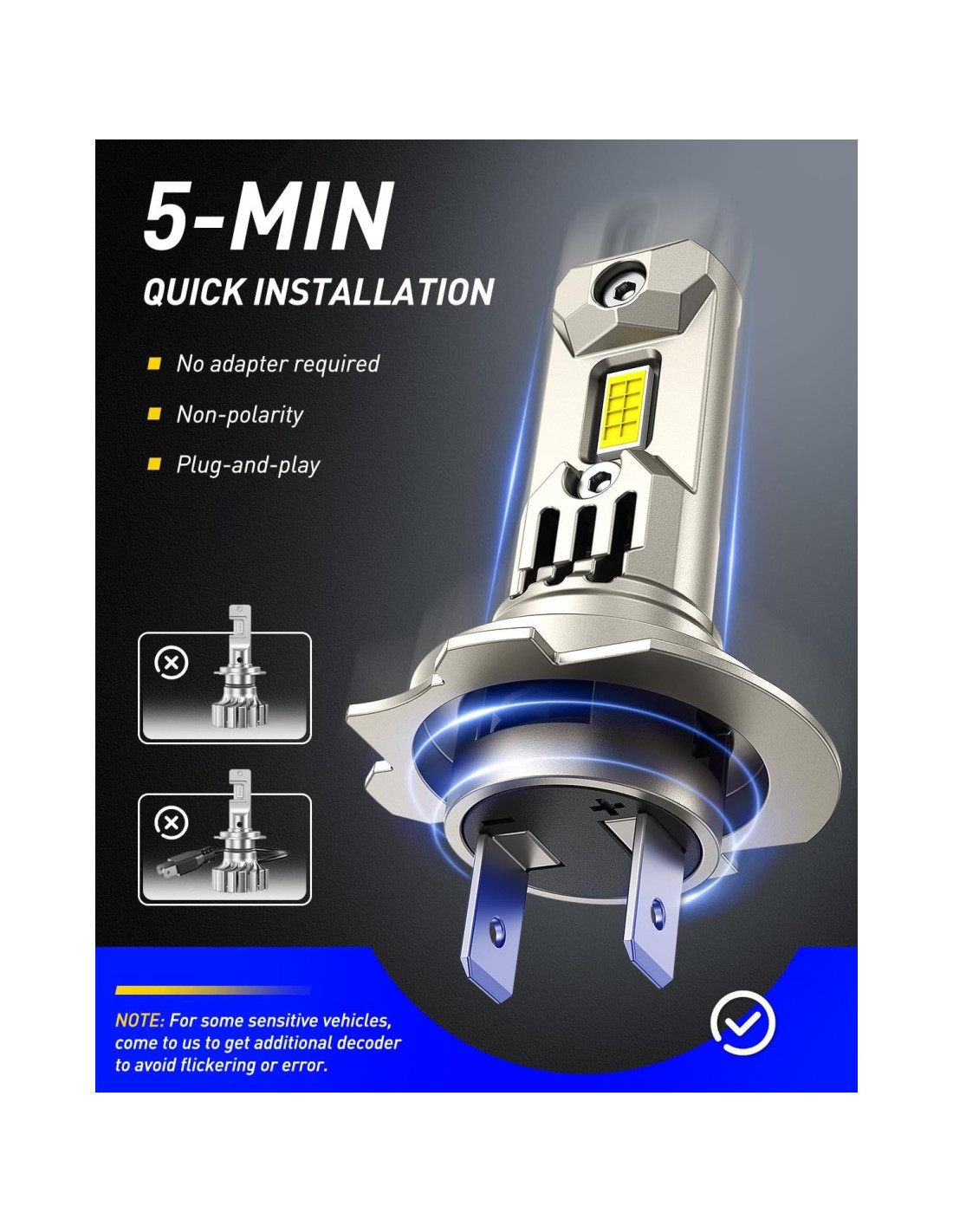 - Instalación Fácil en 5 Minutos Nuestras bombillas cuentan con un diseño todo en uno, coincidiendo con las dimensiones de las bombillas halógenas en una proporción 1:1 sin necesidad de una caja de controlador externa o cables, abordando las limitaciones de espacio durante la instalación. Además, este diseño asegura compatibilidad con la estructura de la bombilla halógena, eliminando la necesidad de adaptadores adicionales. Es realmente plug-and-play, ahorrando tiempo durante la instalación.