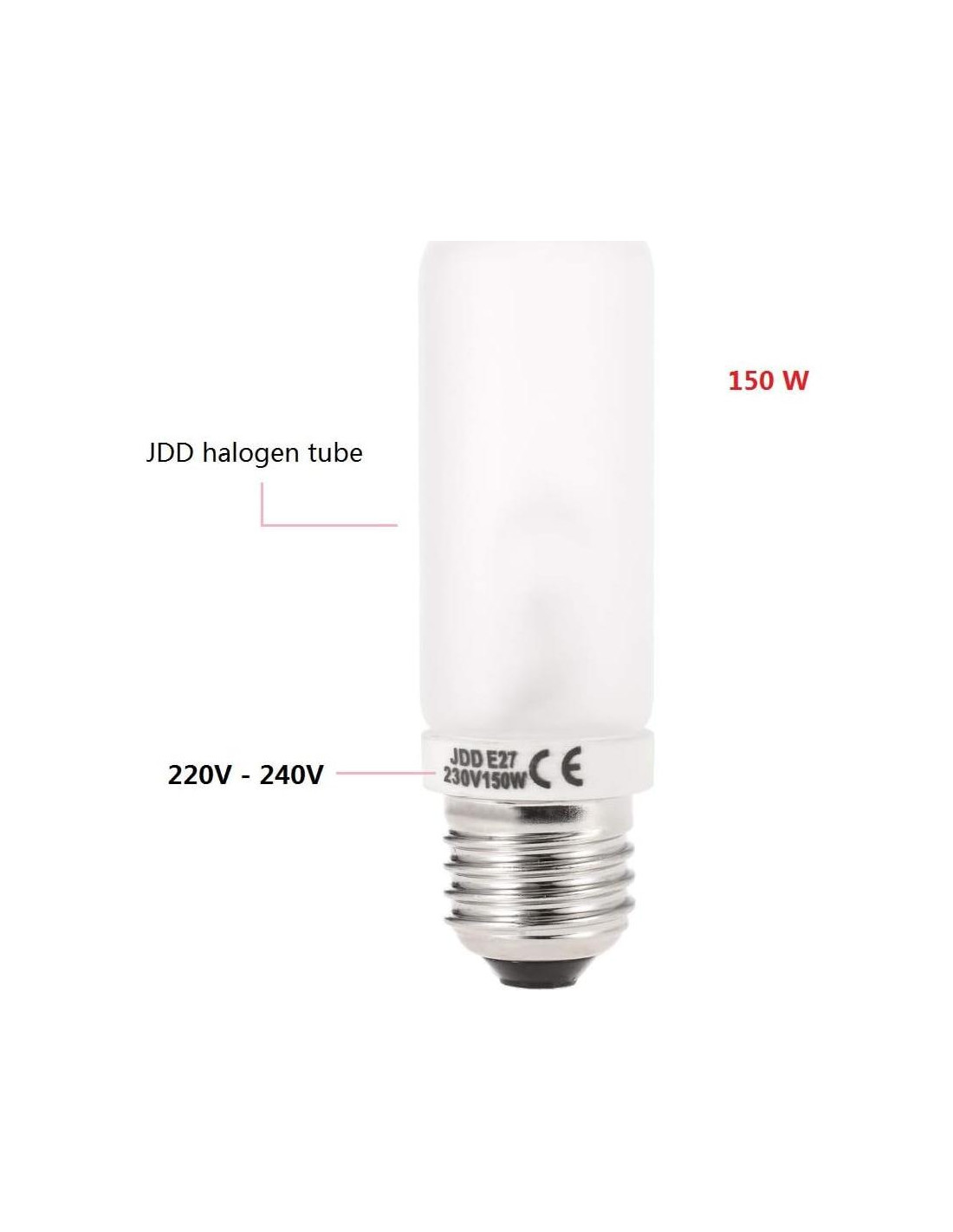 Esta bombilla de modelado de 150W es adecuada para flashes con socket estándar E27/E26. Tubo halógeno JDD, resistente a altas temperaturas, larga vida útil. Especificaciones: Modelo: JDD E27/E26 (entrega aleatoria) Potencia: 150W Socket: E27/E26 Voltaje: 100V-130V Temperatura de Color: 2800K+/-200K. Tamaño del artículo: 10.5 * 3.1 * 3.1cm / 4.1 * 1.2 * 1.2in Tamaño del paquete: 11 * 4.5 * 4.5cm / 4.3 * 1.8 * 1.8in Peso del artículo: 57g / 0.057kg Peso del paquete: 68g / 0.068kg Lista del paquete: 2 * Bombilla de 150W