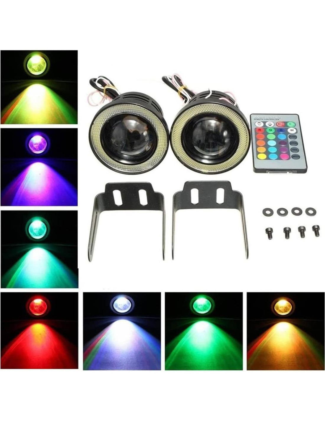 - Diseño único y genial: la luz de niebla consiste en un anillo halo COB blanco xenón y un centro proyector RGB multicolor, control remoto.
