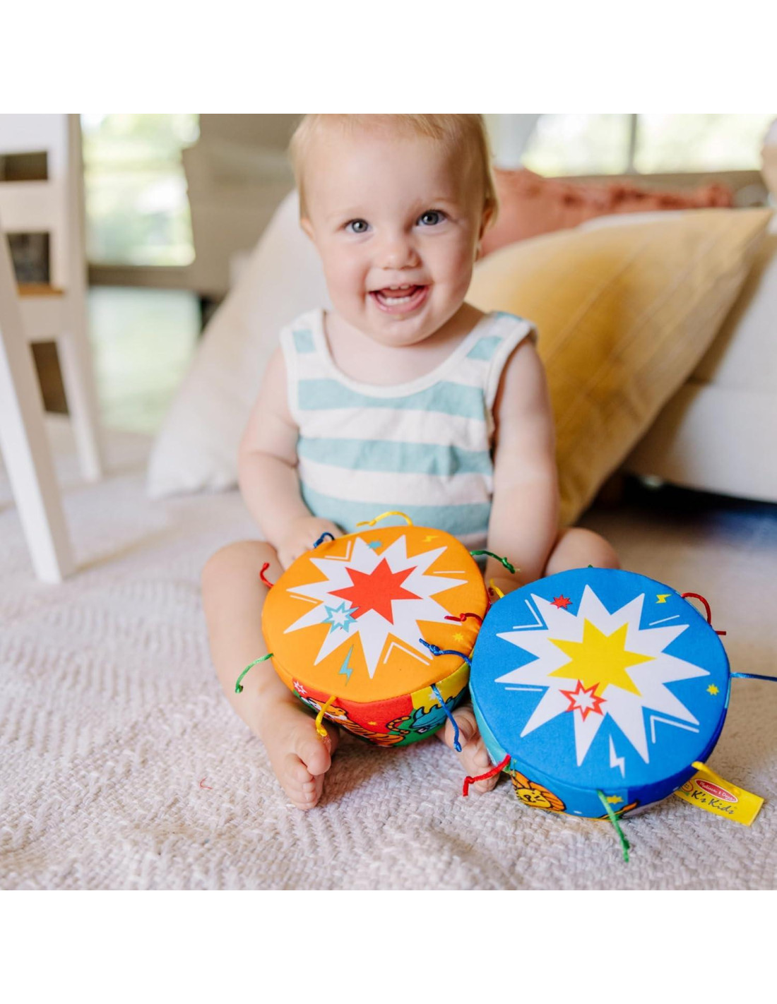 ¡Los niños se divertirán manteniendo el ritmo con estos suaves y coloridos tambores bongo cubiertos de tela! Enciende un interruptor para tocar en modo tambor (da un golpe al tambor y reproduce un ritmo de tambor) o en modo música (reproduce una canción y los niños pueden tocar para agregar sus propios ritmos de tambor). O, apágalo para un toque más silencioso. Los bongos presentan colores brillantes, animales amigables y flecos anudados para agregar textura y promover el agarre.