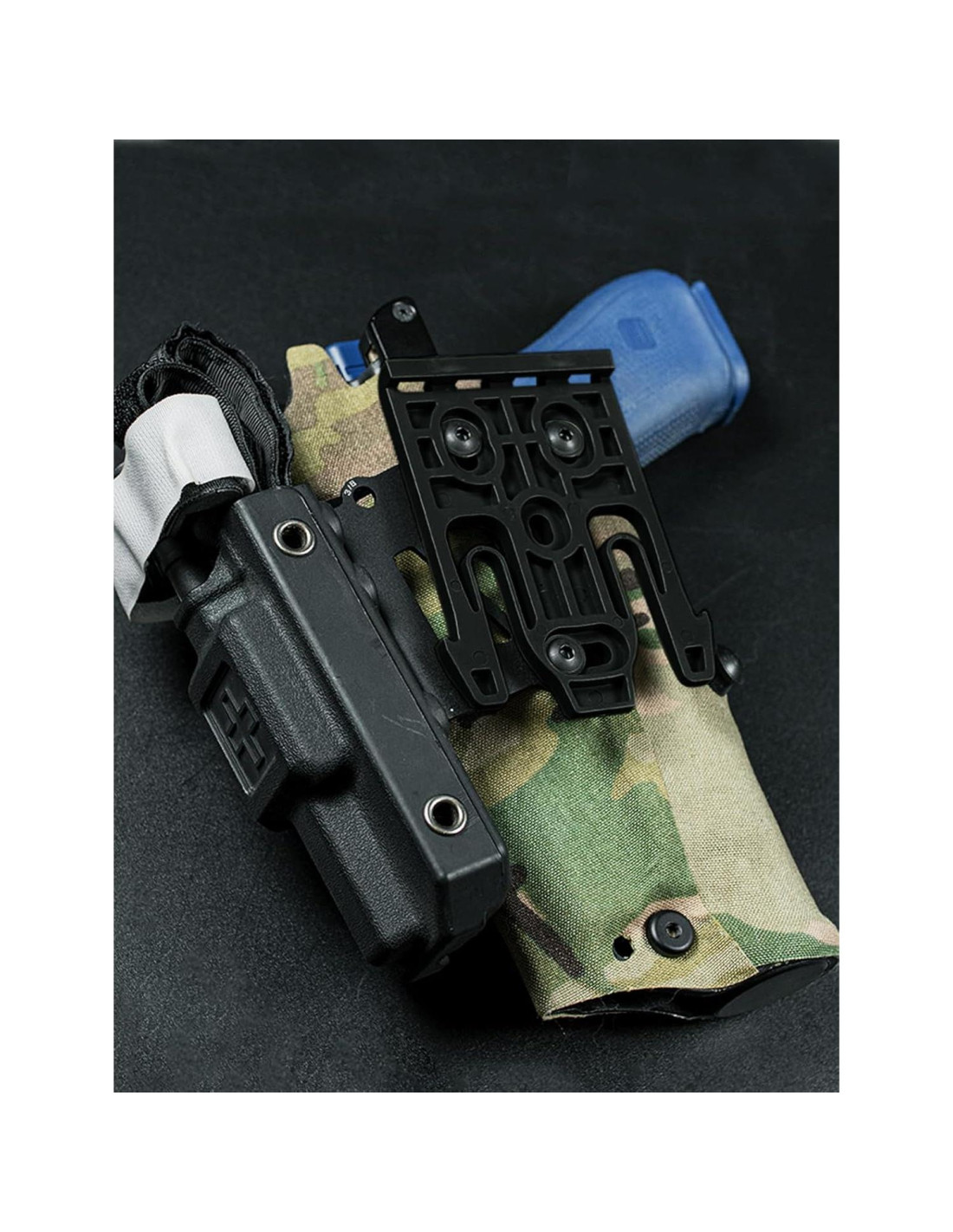 - [Kit de sistema de bloqueo rápido] : Hecho de POM. El tenedor de bloqueo rápido permite un ajuste de ángulo amplio para diferentes escenarios, esta placa receptora se puede adjuntar en cualquier lugar que necesite, como chaleco, cinturón de servicio, funda de pierna, alta / media / baja, muebles, coche y más