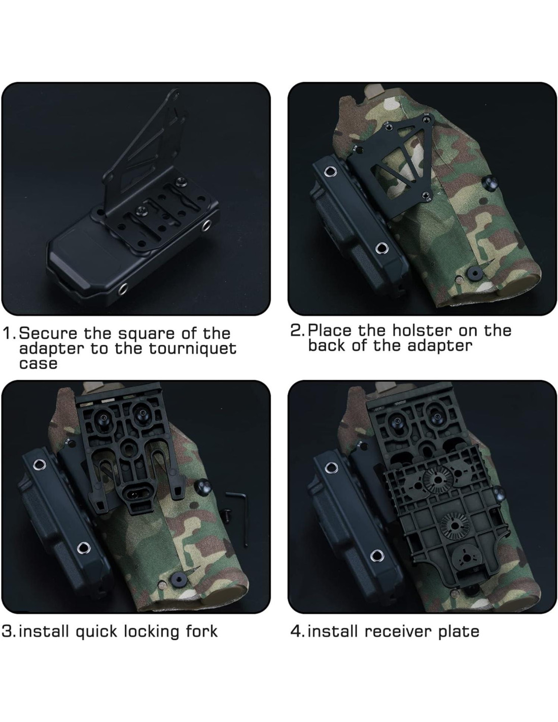 - [Adaptador de funda táctica] : hecho de aleación de aluminio, es fácil montar la funda de torniquete a la funda táctica con tres niveles de altura y dos anchos de instalación de equipo y permite espacio en las fundas, adecuado para uso al aire libre
