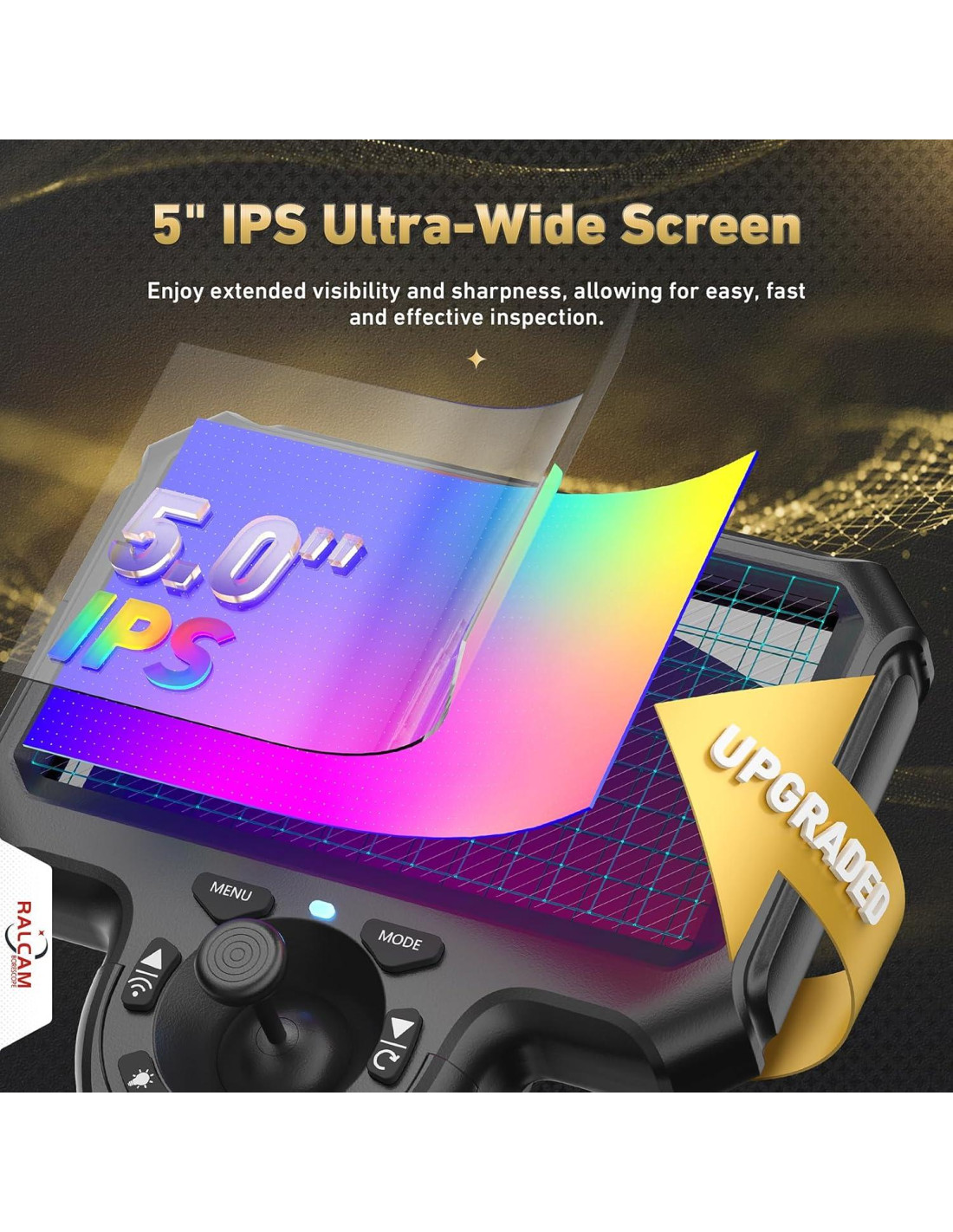 - [Monitor IPS de 5" Confiable] La cámara de inspección de endoscopio articulada utiliza una pantalla grande de 5" 1080 HD. La cámara de inspección de video Ralcam puede tomar video y fotos en vivo a 1280(h) x 720(v). La cámara de borescopio tiene 6 luces LED de alta intensidad integradas con 4 niveles de brillo ajustables para diferentes situaciones de oscuridad. NOTA: Lente impermeable IP67, por favor seca las manchas de agua de la lente después de usar