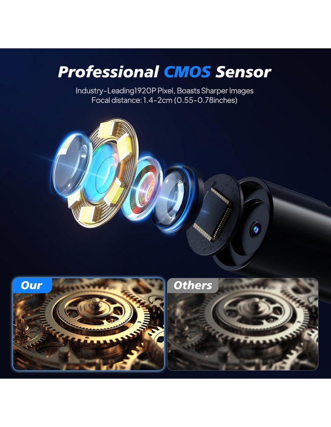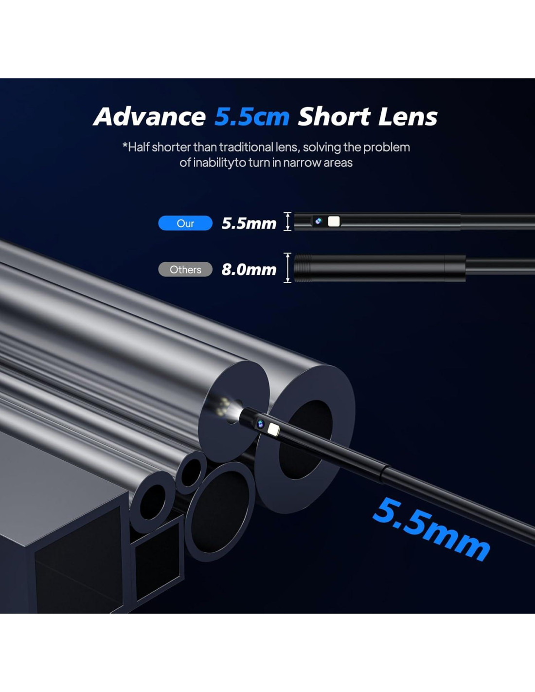 - Cámara de DUAL LENTES: El endoscopio de inspección adopta una sonda de cámara HD de 1920P, con solo tocar un botón, puedes cambiar entre imágenes frontales y laterales o grabar videos. Equipado con una distancia focal de 2-10cm, para lograr una detección más precisa de problemas.