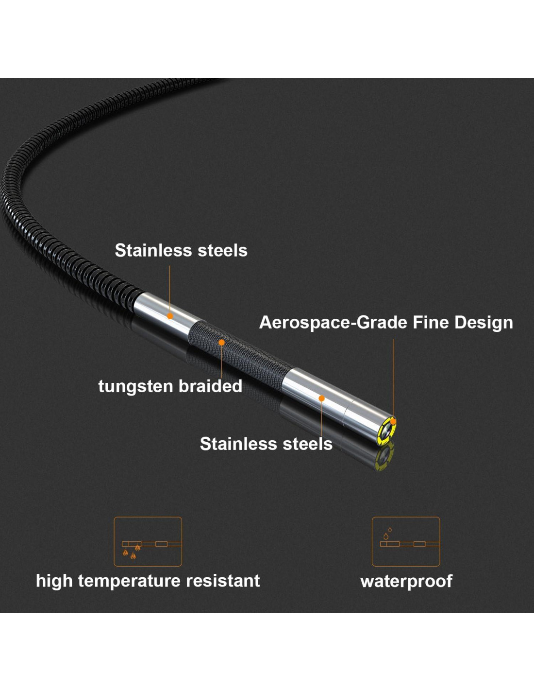 - Construcción Industrial. La parte de la cámara de serpiente articulada está construida con acero inoxidable y tubo trenzado de tungsteno, puede soportar altas temperaturas de hasta 60C (140F). La sonda de cuello de ganso semirrígido tiene un equilibrio bien diseñado entre flexibilidad y rigidez para entrar en una variedad de lugares estrechos.