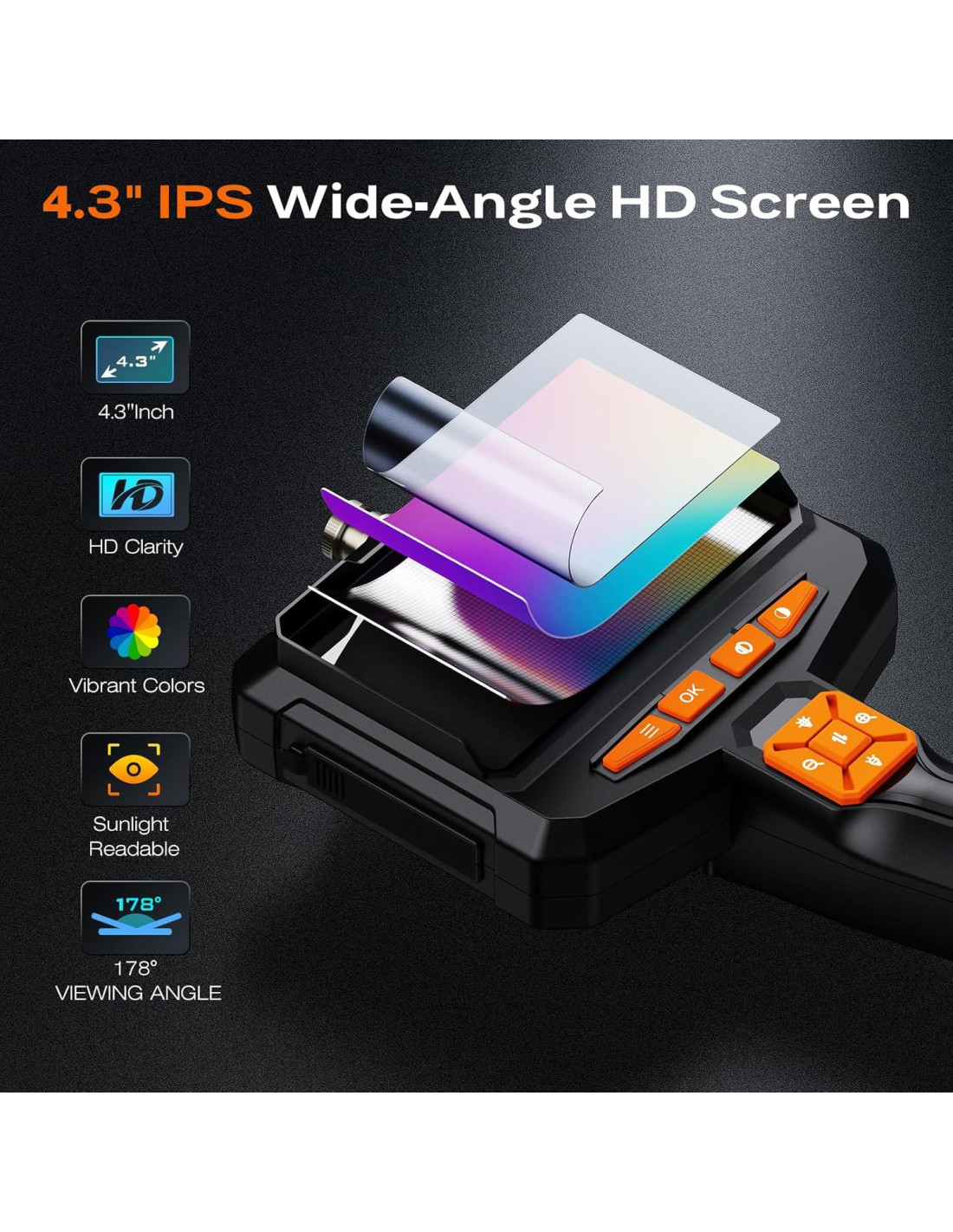 - [Pantalla HD de 4.3 Pulgadas] Esta cámara de endoscopio de mano cuenta con una pantalla IPS a color de 4.3 pulgadas para visualización en vivo en HD con un ángulo de visión amplio de 170, asegurando inspecciones exhaustivas. La inversión de imagen ajustable y los ajustes de contraste ayudan a capturar detalles más finos sin esfuerzo. No se necesita Wi-Fi, aplicaciones o emparejamiento con smartphone, solo enciéndalo y comience a inspeccionar de inmediato.