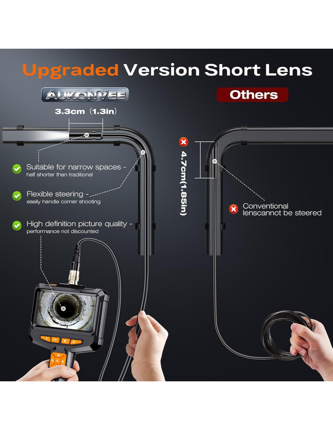 - [Cámara de serpiente semirrígida de alta calidad de 16.4FT (5 m)] El cable semirrígido de 16.4FT es tanto rígido como flexible, permitiendo que se doble y mantenga su forma para acceder a espacios estrechos y satisfacer diversas necesidades. Ampliamente utilizado en inspecciones mecánicas, mantenimiento automotriz, reparaciones de tuberías, inspecciones de alcantarillado, trabajos eléctricos, inspecciones de paredes, verificaciones de HVAC y otros campos.