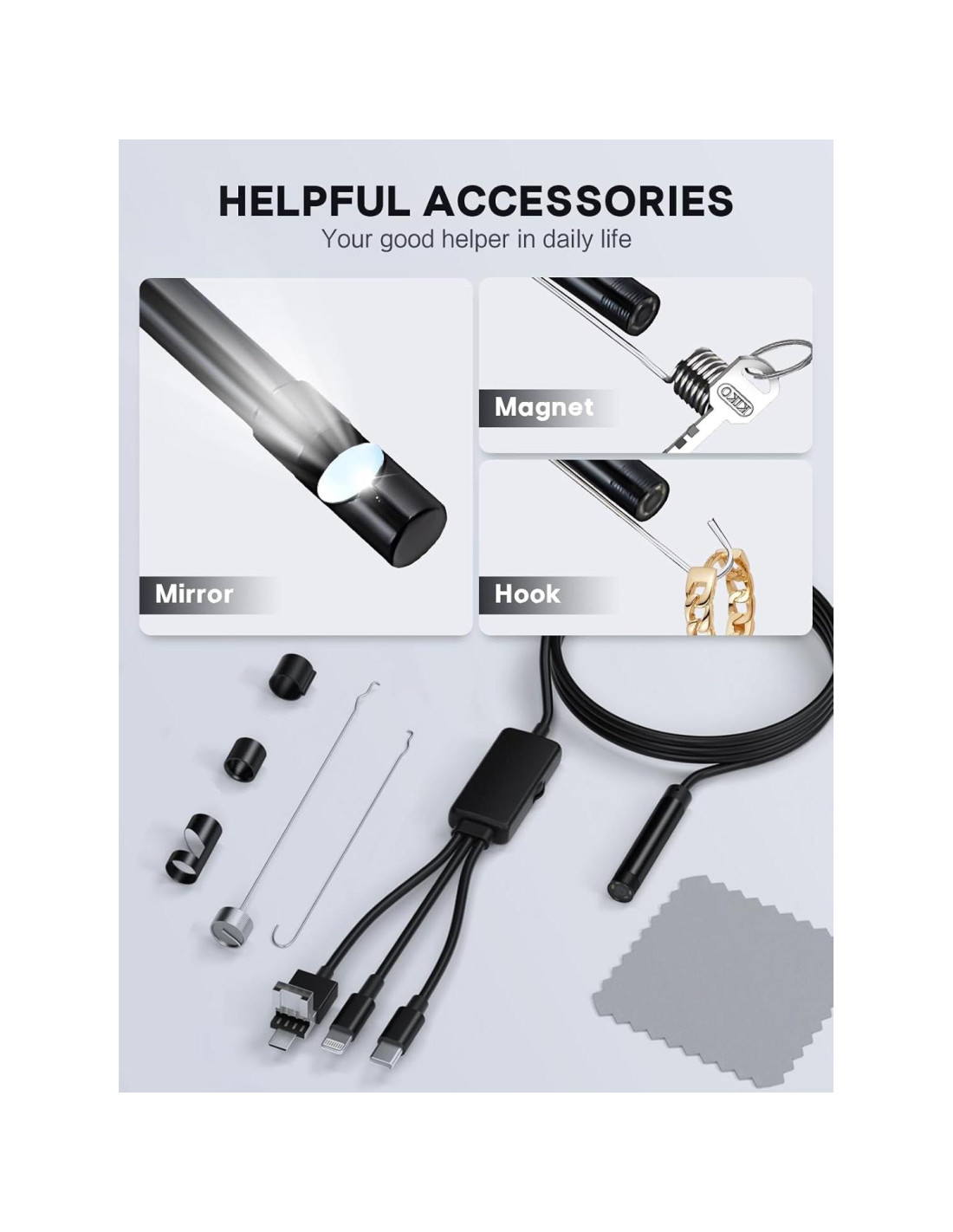 VYNCS 4 en 1 Borescopio, Cámara Endoscópica con Luz 1. Un endoscopio de doble lente proporciona a los clientes un rango más amplio de ángulos. 2. El borescopio con luces tiene una resolución de alta definición de 1920P y 2 millones de píxeles para proporcionar a los clientes videos e imágenes de ultra alta definición. 3. Compatible con Android 7.0+ y iPhone15+ y iPad con puerto Type-c, fácil de conectar a aplicaciones. gadgets para hombres. 4. Con una longitud de 5m (16.5ft), el cable semirrígido permite que la cámara de serpiente se doble, facilitando el acceso a diversas áreas estrechas y angostas. 5. El diseño a prueba de agua IP67 permite que el borescopio funcione bajo el agua hasta 1m (3.28ft) durante 1 hora.