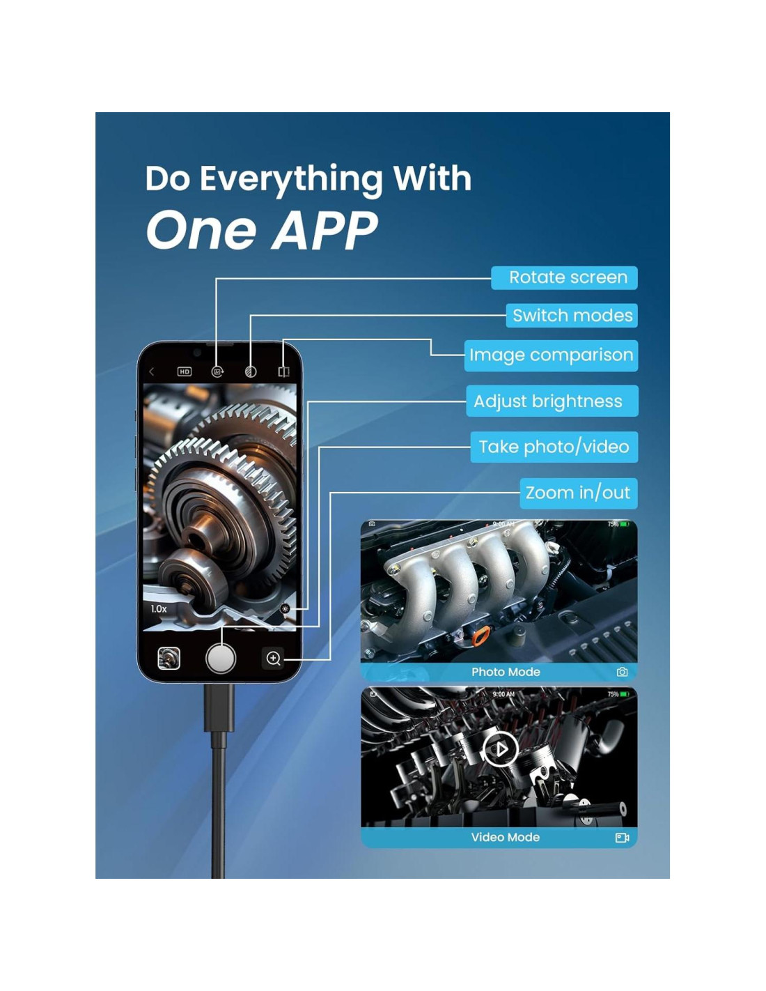 - [Características Poderosas] La imagen del lente del endoscopio EOM1 puede rotarse 360, lo que puede ser operado directamente en el teléfono móvil sin ajustar el cable. También soporta comparación de imágenes en tiempo real. Al usar esta función, aparecerán dos imágenes en la pantalla, una es la foto que se ha tomado, y una es el metraje en tiempo real.