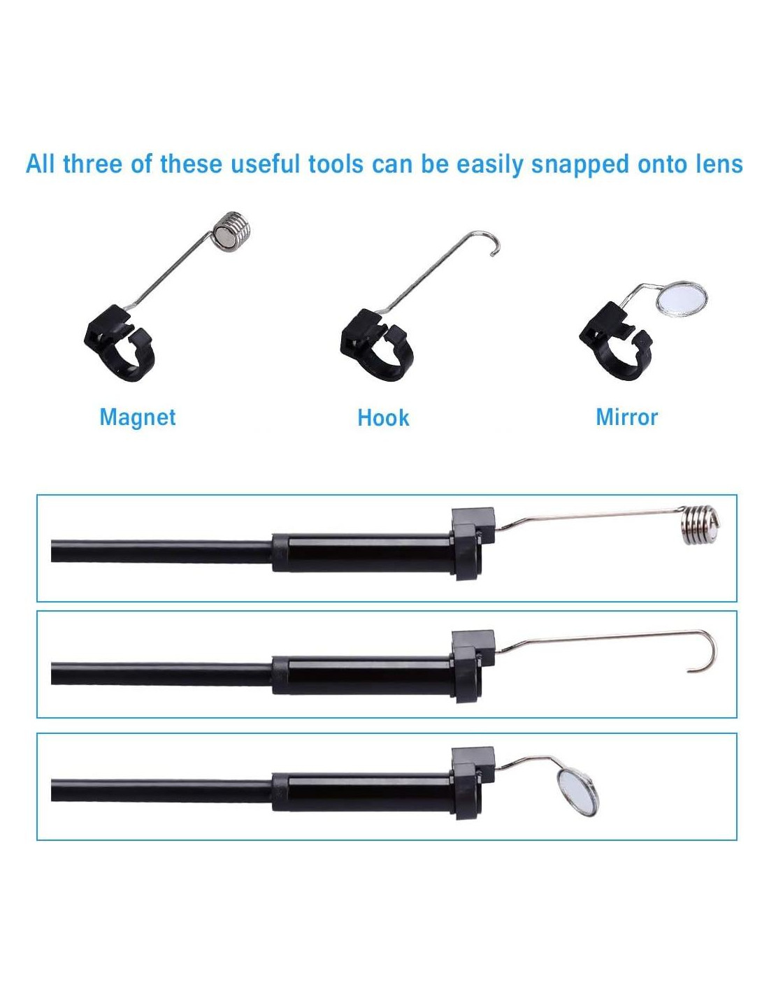 - MÚLTIPLES FUNCIONES: Reparaciones de plomería, inspección de aire acondicionado, detección de alcantarillado, mantenimiento de vehículos, tubería de ventilación, maquinaria, motor, automotriz, barco, inspección de aeronaves. Con su tamaño mini y las funciones de fotografía y video, puede encontrar el problema rápidamente y solucionarlo.