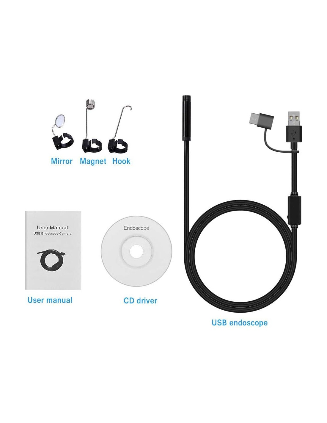 - DISPONIBLE PARA ANDROID/PC/LAPTOP: Para teléfonos inteligentes Android (NO para iPhone): Conecte el endoscopio al teléfono inteligente conectándolo al puerto mini USB, escanee el código QR en el manual e instale la aplicación, luego la cámara está lista para funcionar. Para PC/Laptop: Conecte el endoscopio a su computadora conectándolo a USB, abra la aplicación en el CD del controlador para previsualizar la imagen, capturar fotos o videos, y comenzar a trabajar con la cámara.