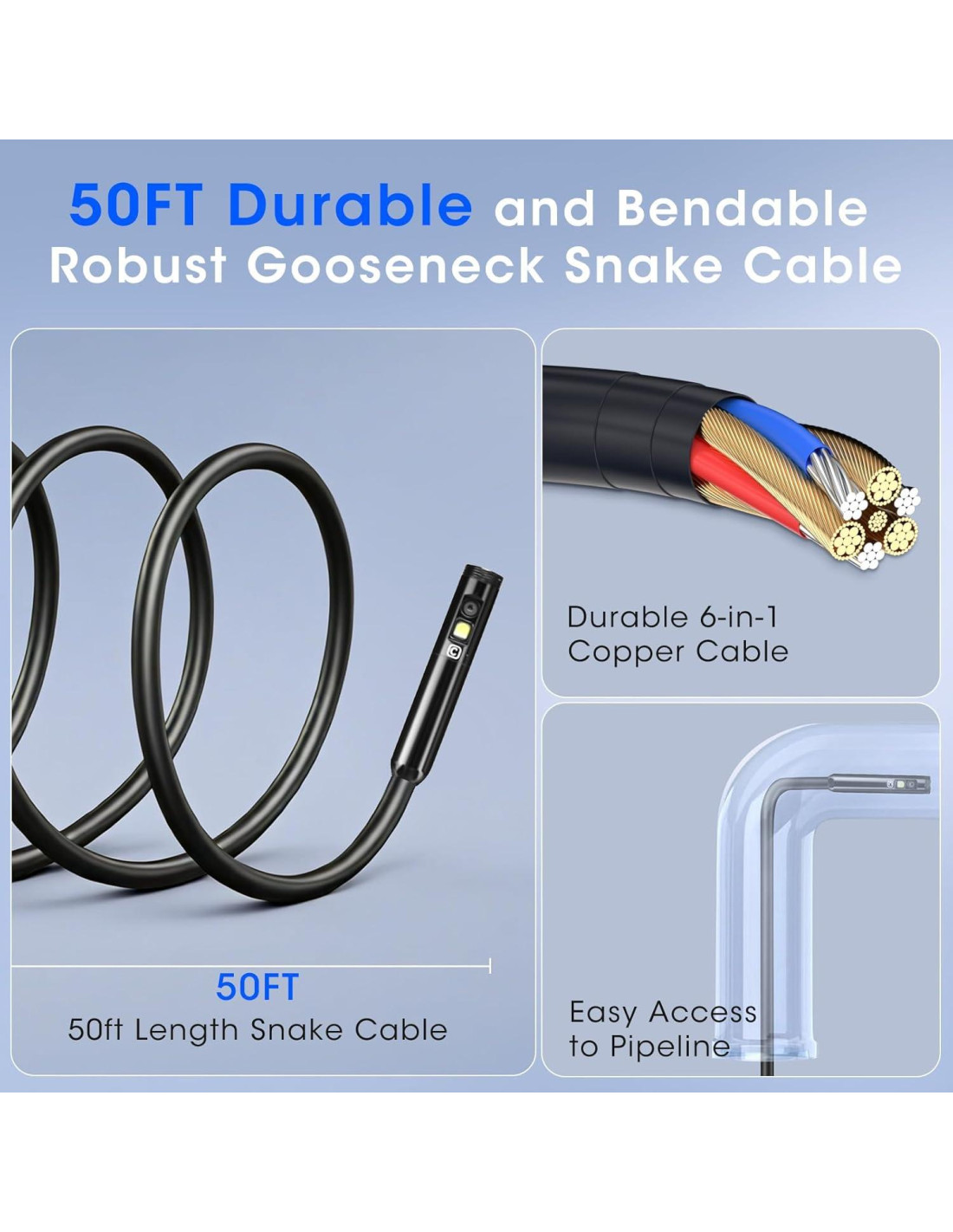 - Cable de Serpiente Gooseneck Duradero de 50FT (15m): Este borescopio viene con un cable de 50ft que puede detectar cualquier profundidad que desees. Este cable gooseneck está hecho de cobre puro, más duradero, y ha mejorado enormemente el rendimiento de transmisión en tiempo real. También es fuerte y flexible, por lo que se puede usar para tuberías de cualquier forma.