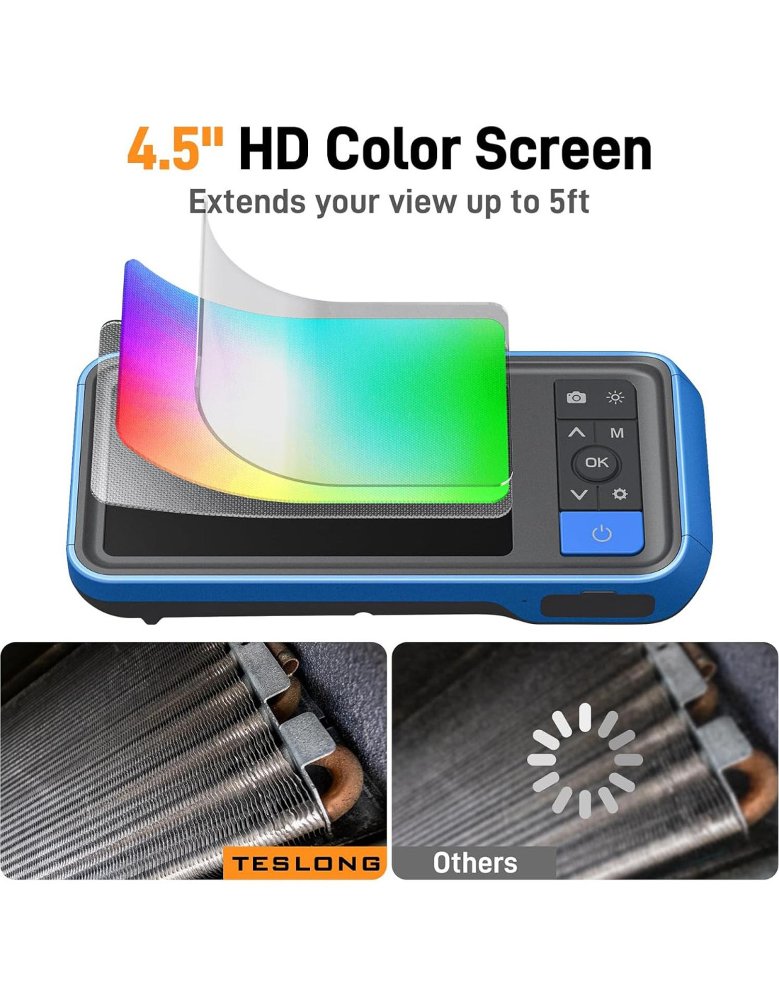 La misión de Teslong es hacer tu vida más fácil ayudándote a resolver problemas, ya seas un contratista profesional o un entusiasta del bricolaje en casa. Teslong cuenta con un equipo internacional de más de 40 ingenieros, diseñadores y desarrolladores trabajando arduamente para mejorar nuestros productos y satisfacer a nuestros clientes a diario, por eso tomamos muy en serio los comentarios de nuestros clientes y estamos muy emocionados por el futuro. Donde la Estética se Encuentra con la Práctica. Obtén Más Campo de Visión y Imágenes Más Claras. Extiende Tu Visión a Espacios Estrechos. Maximiza la versatilidad de inspección con el cable de cámara semirrígido. Navega sin esfuerzo por espacios reducidos y captura imágenes desde múltiples ángulos. Este diseño asegura tanto flexibilidad como estabilidad, ofreciendo una herramienta confiable para diversas tareas de inspección. La cámara de inspección cuenta con una varilla retráctil elegante que se colapsa a apenas 0.28 metros. Este diseño compacto asegura que la herramienta sea fácilmente portátil y simple de almacenar, convirtiéndola en un compañero ideal para inspecciones en el campo o en movimiento. Asegurando que cada detalle sea vívidamente visible, proporcionándote una claridad visual sin igual. El alcance impermeable IP67 asegura un rendimiento confiable incluso en condiciones húmedas sin preocupación por el impacto del agua o la humedad. Proporcionando iluminación en áreas oscuras y húmedas, permitiendo inspecciones no invasivas con claridad. Gancho: Recupera objetos de difícil acceso. Imán: Atrae artículos metálicos.