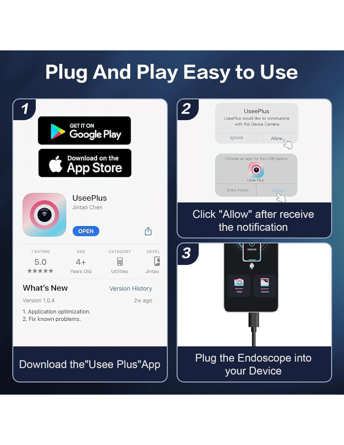 - Conexión Fácil: Esta cámara de inspección borescope se puede conectar fácil y rápidamente con dispositivos IOS 9.0+/Type C a través de la interfaz. Busca 'USEEPLUS' en la tienda de aplicaciones o escanea el código QR para descargar la APP. Con operaciones simples, puedes ver imágenes en tiempo real en la pantalla. Gadgets geniales para hombres.