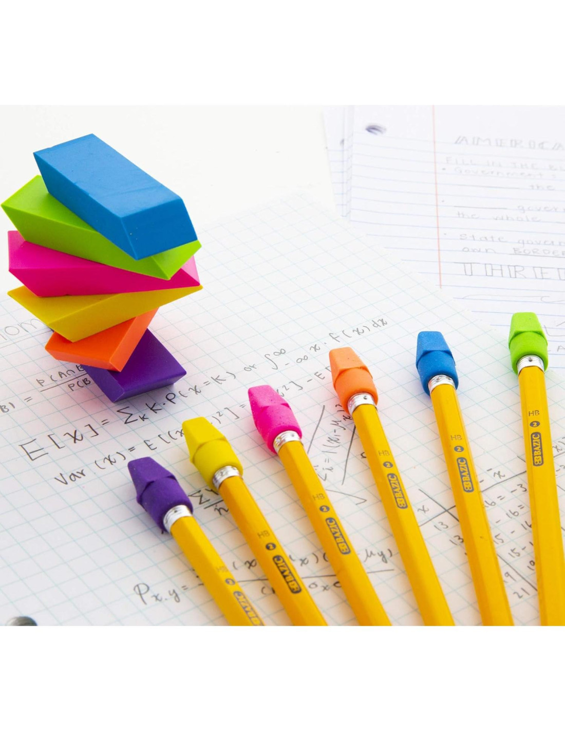 - LINDO Y DIVERTIDO. Punta en forma de cincel: esquinas afiladas y cara plana te ayudan a borrar tanto detalles como áreas grandes. Los borradores de colores surtidos adornan los lápices, hacen que escribir y aprender sea más divertido.