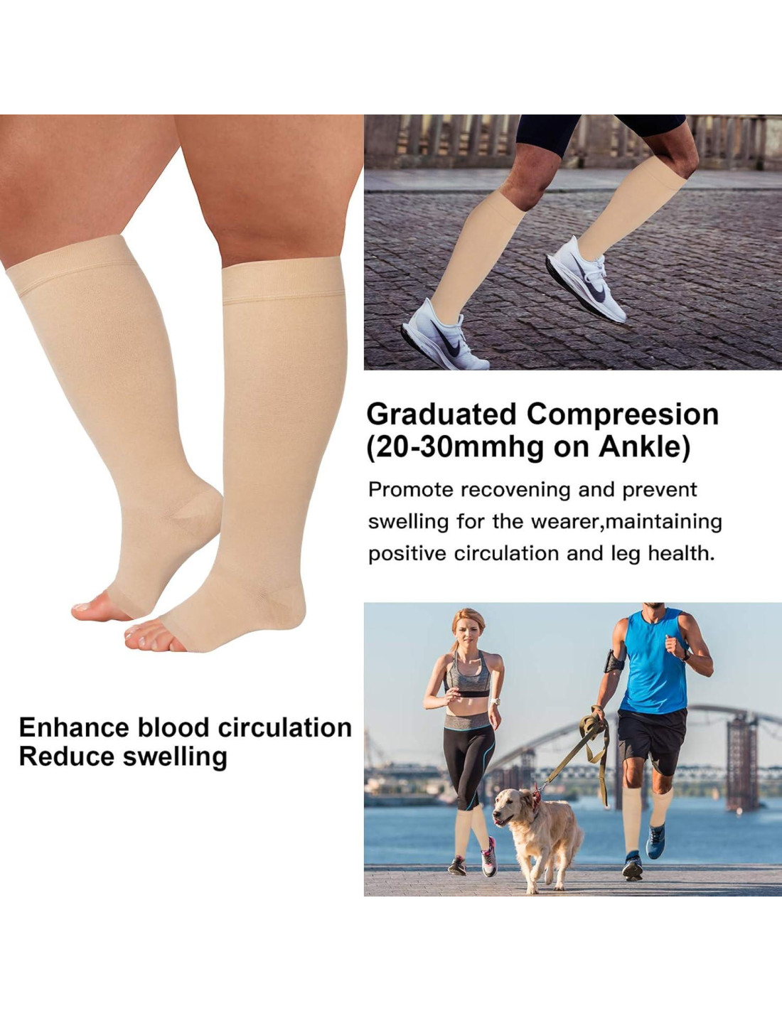 ¿Te preocupan los calcetines de compresión demasiado ajustados o pequeños? ¿No puedes encontrar calcetines de compresión adecuados debido a que tienes pantorrillas de tamaño extra grande? ¡Los nuevos calcetines de compresión con punta abierta de Blahhey resuelven todas tus preocupaciones! Mejora la circulación sanguínea, reduce la hinchazón, previene las varices, alivia la fatiga y el dolor muscular, ayuda en la recuperación postquirúrgica y atlética, previene lesiones en el tobillo. Los calcetines de compresión sin dedos de talla grande brindan soporte para las piernas (20-30 mmHg). Mejora la circulación sanguínea de manera efectiva y reduce la hinchazón sin ningún ajuste incómodo. Utiliza material de nailon y spandex. Hace que los calcetines de compresión tengan mejor elasticidad y durabilidad. Adecuado para personas con varices, que trabajan mucho tiempo, enfermeras, corredores, ciclistas, trabajadores de oficina, viajeros en avión, atletas, entrenamientos de fitness, mujeres embarazadas, enfermeras y doctores, personas mayores, viajeros frecuentes o cualquier persona que tome un vuelo largo. Personas de negocios con puestos de escritorio que requieren estar sentados por períodos prolongados. Trabajadores de construcción, chefs, trabajadores de línea y personal de servicio de restaurantes. Maestros, almacén, empaque o ocupaciones de entrega.