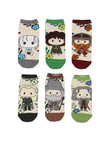 Presentamos los Calcetines de Tobillo Sin Mostrar de El Señor de los Anillos en Paquete de 6, una colección impresionante para los fanáticos del increíble clásico de fantasía. Este conjunto único presenta seis diseños únicos en tonos tierra, cada uno entrelazado sin problemas con personajes queridos de la película. Este cautivador conjunto presenta seis diseños únicos inspirados en los personajes y símbolos atemporales del mundo de J.R.R. Tolkien. Los seis diseños incluyen personajes como Gollum, Frodo, Legolas, Gimli, Aragorn y Gandalf el Gris, con acentos florales añadidos. Hechos de una suave y elástica mezcla de 98% poliéster y 2% spandex.
